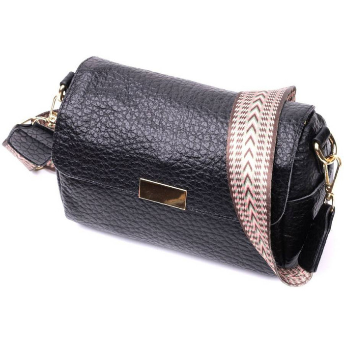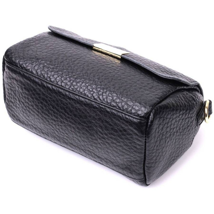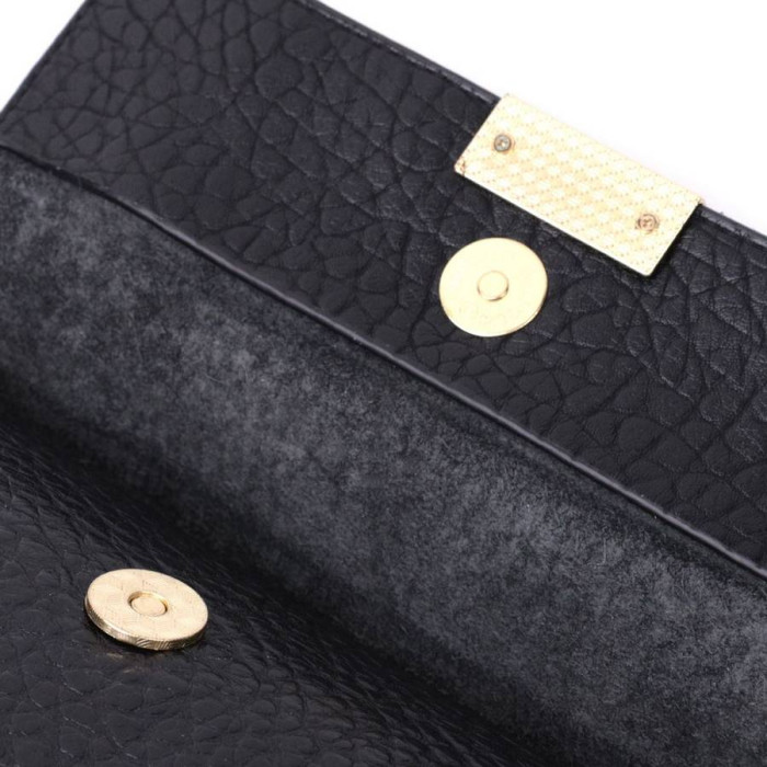 Цікава сумка для жінок у класичному чорному кольорі з якісної натуральної м'якої шкіри, яка довго носиться і не втрачає свого первісного вигляду. Аксесуар складається з основного відділення, потайної кишені на блискавці, кишені відкритого типу, а також двох невеликих бічних кишень зовні. Носити сумку можна під рукою, на плечі і через плече, для цього є текстильний ремінь, що знімається. У виробі використано якісну фурнітуру кольору жовтого золота. Чудовий варіант сумки на кожен день.
