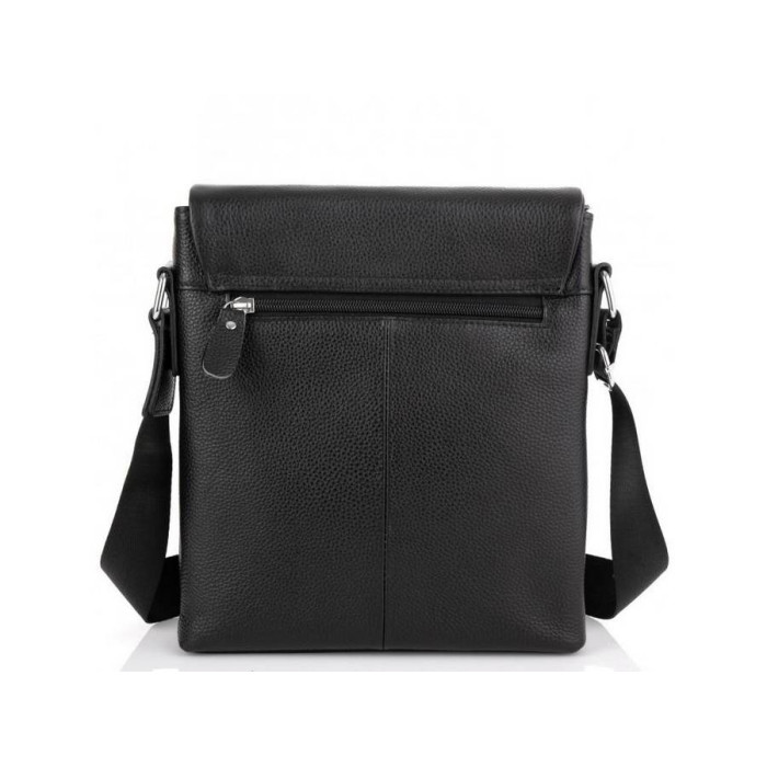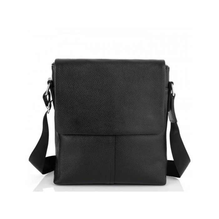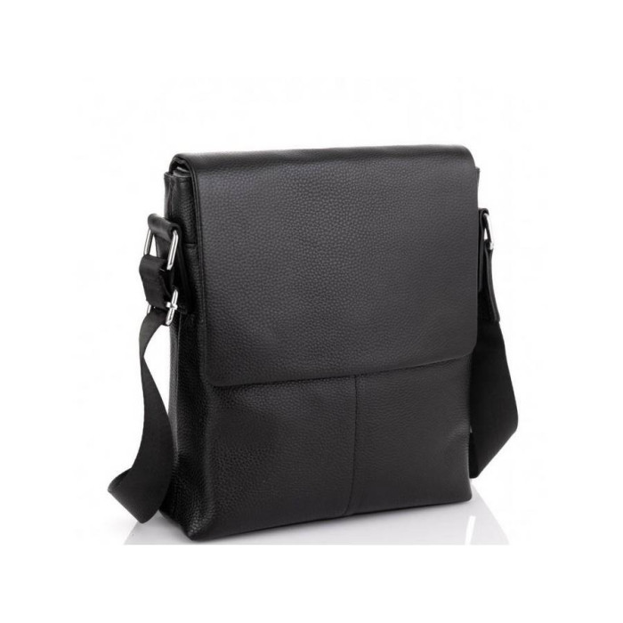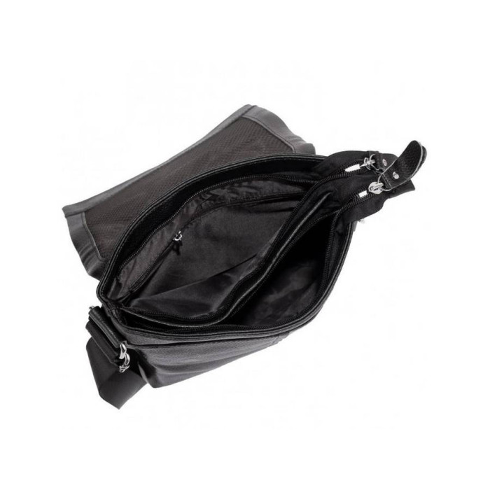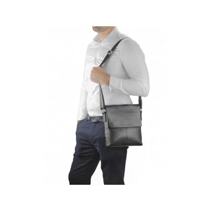 Чорний месенджер для чоловіків з зернистою текстурою. Плечовий ремінь регулюється по довжині і зроблений з міцного текстилю, фурнітура срібного кольору. Сумка через плече має два основних відділення на блискавці, вони накриваються клапаном на двох магнітах. Всередині є кишеня на блискавці і дві кишені відкритого типу. Також на тильній стороні є кишеня на блискавці.