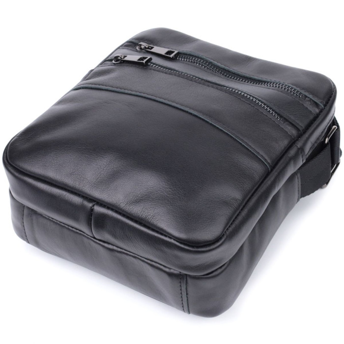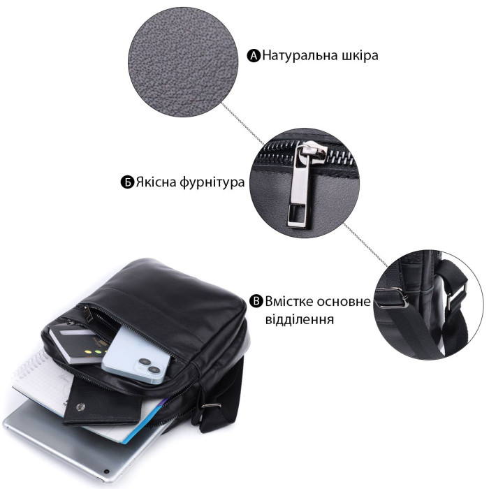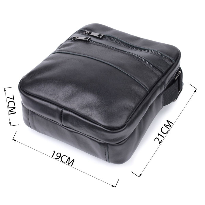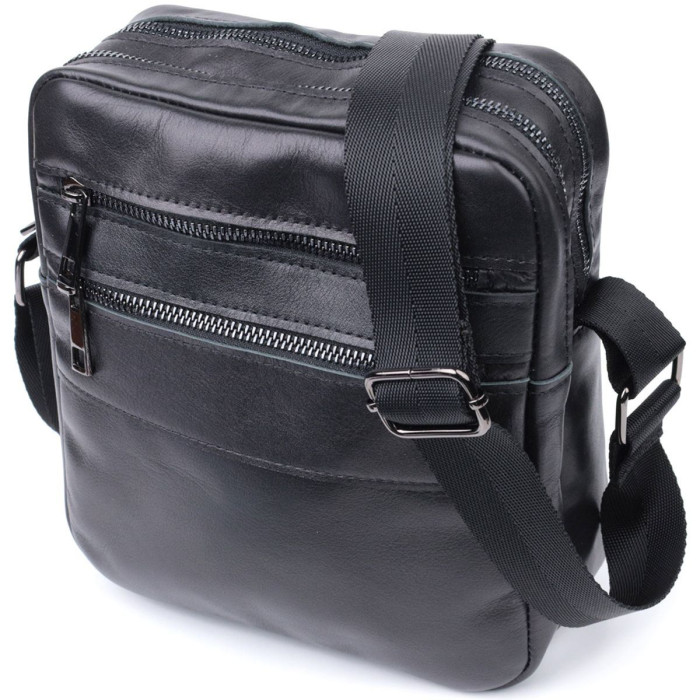 Цікава чоловіча сумка месенджер, з великою кількістю кишень, в яку помістяться всі необхідні речі і навіть міні айпад. Чудова чоловіча сумка вертикального формату виготовлена з натуральної гладкої шкіри чорного кольору. Фурнітура металевого кольору - стійка не змінює свій колір у процесі носіння. Аксесуар чудово поєднується з усіма стилями в одязі та може стати чудовим подарунком на будь-яке свято.
