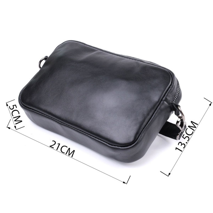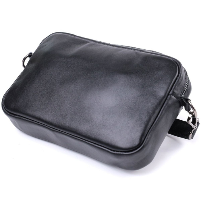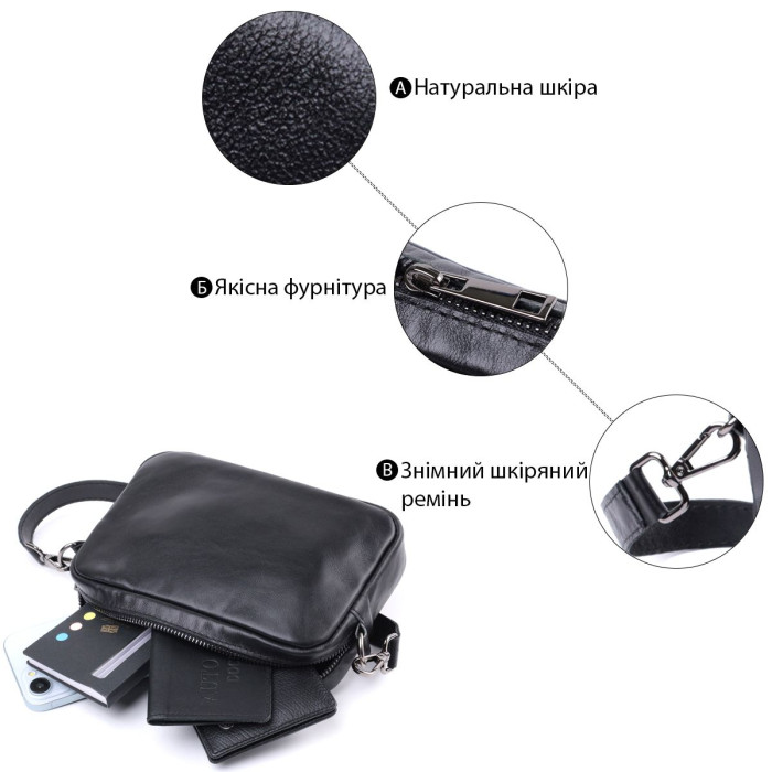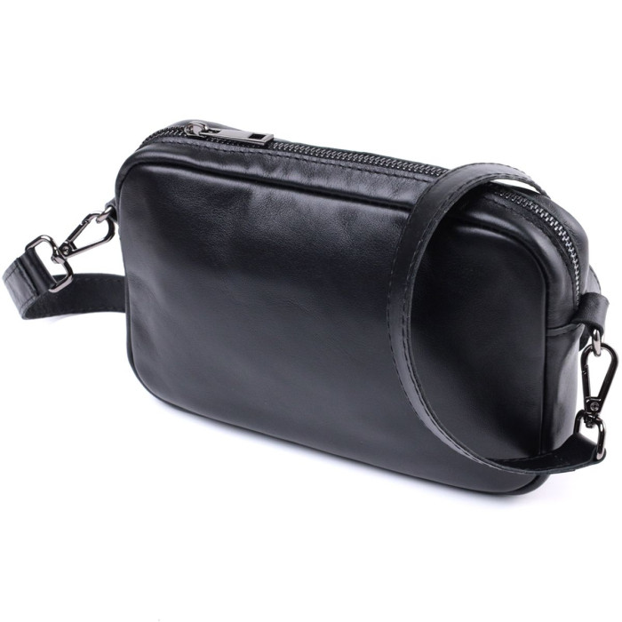 Цікава жіноча сумка, яку можна носити через плече як крос-боді, на плечі і як клатч в руках, для цього ремінець легко відстібається. Виріб виконаний у класичному чорному кольорі з гладкої з глянцевим блиском шкіри. Шкіра м'яка, приємна на дотик із високими показниками зносостійкості. Відмінний варіант як кожного дня, так і на вечір. Сумка добре тримає форму, має міцну підкладку, фурнітура срібного кольору – стійка не змінює свій колір у процесі носіння. Аксесуар чудово поєднується з усіма стилями в одязі та може стати чудовим подарунком на будь-яке свято.