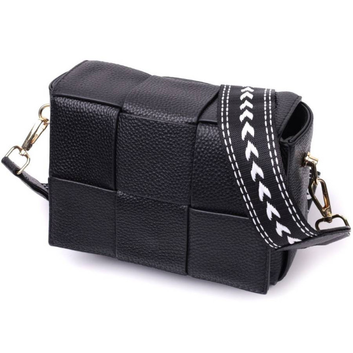 Приваблива жіноча сумка з переплетеної шкіри та кишенею-косметичкою всередині. Виріб пошитий з якісної натуральної м'якої шкіри, яка довго носиться і не втрачає свого первісного вигляду. Аксесуар складається з одного відділення, в якому пристібається кишеня косметичка на блискавці. Носити сумку можна під рукою, на плечі та через плече, для цього є текстильний ремінь, що знімається. У виробі використано якісну фурнітуру кольору жовтого золота. Універсальний варіант сумки як на вечір так і як сумочка на кожен день.
