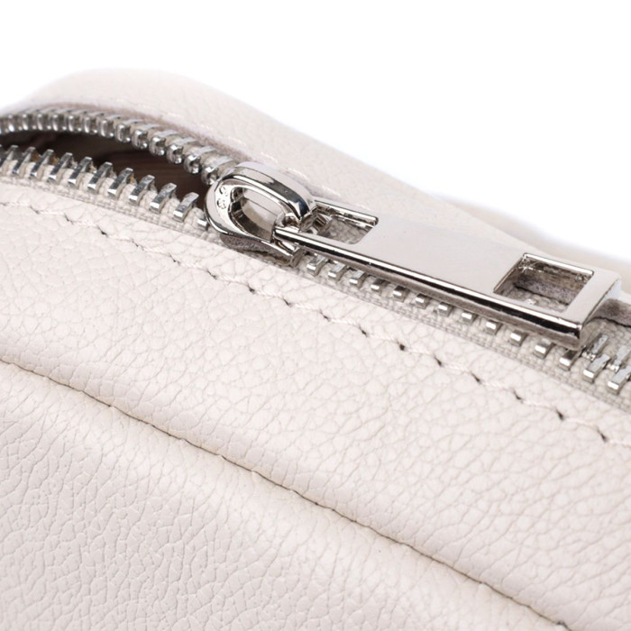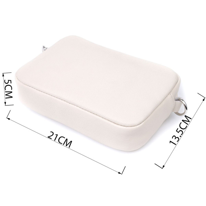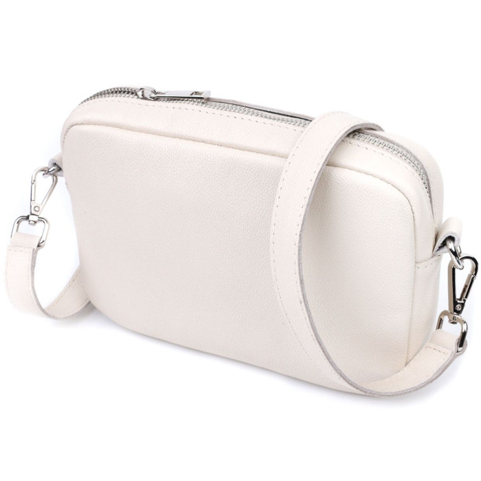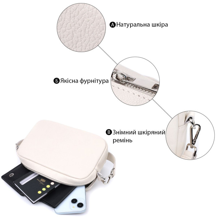 Універсальна жіноча сумка, яку можна носити через плече як крос-боді, на плечі і як клатч в руках, для цього ремінець легко відстібається. Виріб виконаний у красивому бежевому кольорі із зернистої натуральної шкіри стійкої до подряпин. Шкіра м'яка, приємна на дотик із високими показниками зносостійкості. Відмінний варіант як на кожнен день, так і на вечір. Сумка добре тримає форму, має міцну підкладку, фурнітура срібного кольору – стійка не змінює свій колір у процесі носіння. Аксесуар чудово поєднується з усіма стилями в одязі та може стати чудовим подарунком на будь-яке свято.