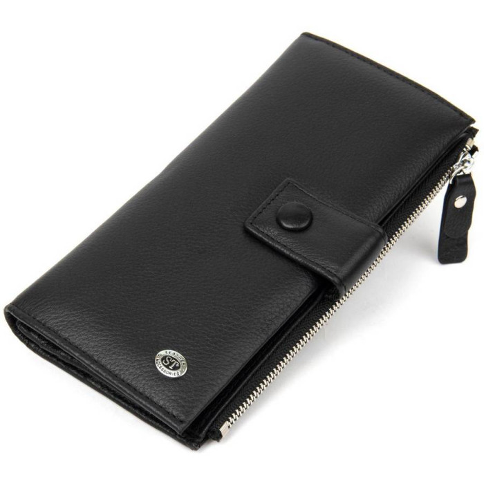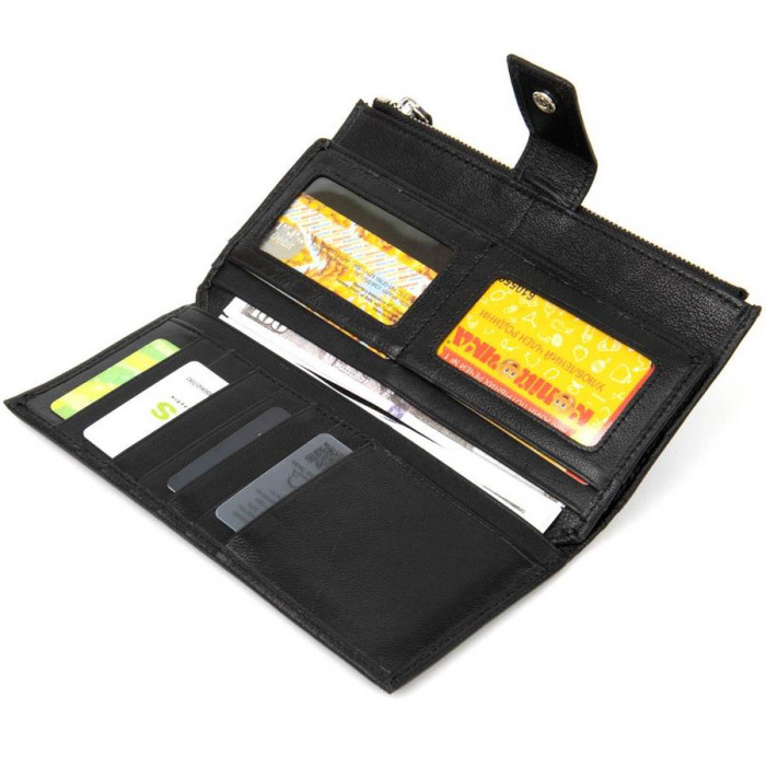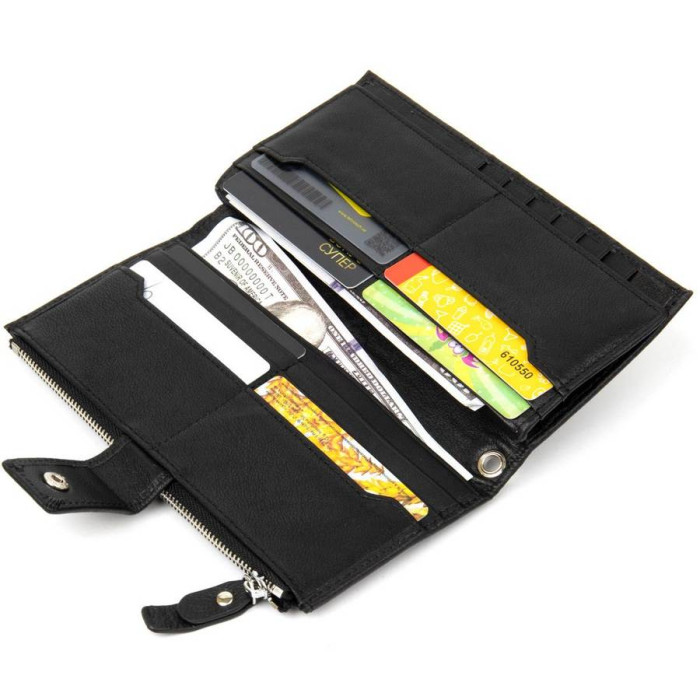 Гарний і функціональний гаманець-клатч в класичному чорному кольорі. Виконаний з натуральної шкіри високої якості, має матову зернисту фактуру і дуже приємний на дотик, що важливо при щоденному використанні. Всередині має багате наповнення у вигляді безлічі кишень і відділень, також є зовнішня монетниця на блискавці. Упакований клатч в тверду фірмову упаковку.