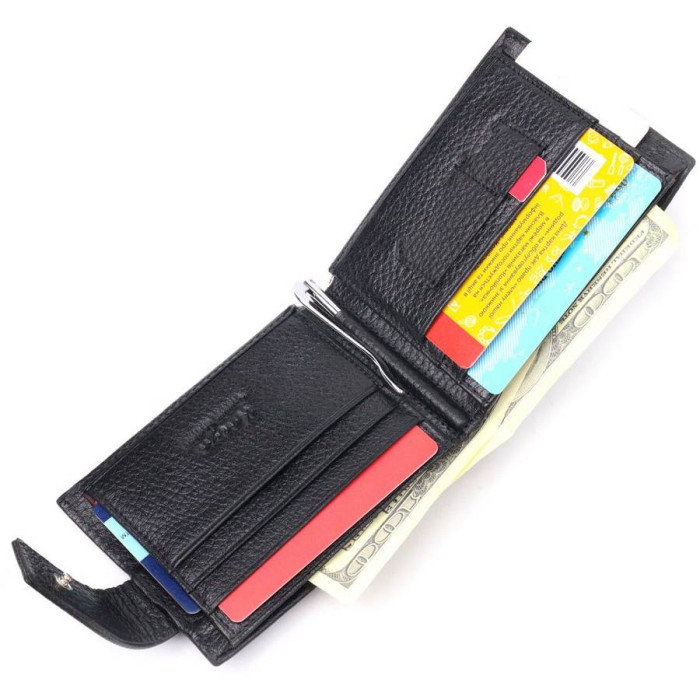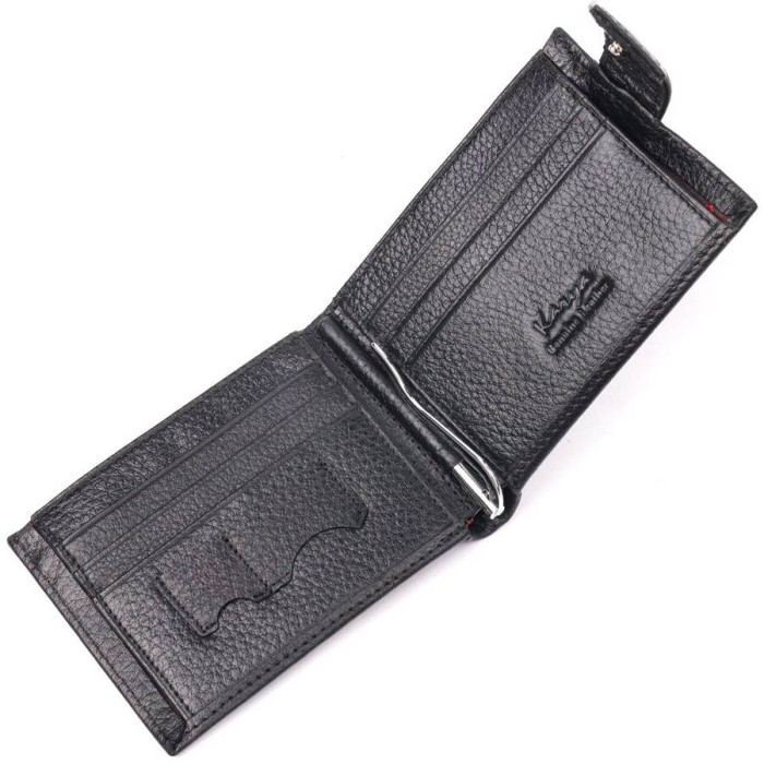 Зручний затискач для купюр виконаний із добротної натуральної шкіри чорного кольору. Купюри фіксуються металевим утримувачем. Користь затиску полягає в тому, що він набагато компактніший, ніж гаманець, легко поміщається в руку або кишеню. Крім того, аксесуар надійніше та безпечніше закріплює гроші, тому краще вибрати саме його. Аксесуар упакований у фірмову коробочку. Вироби з натуральної шкіри завжди будуть чудовим подарунком для близької людини.