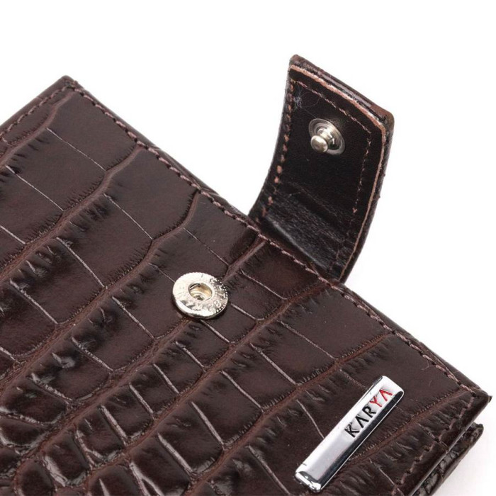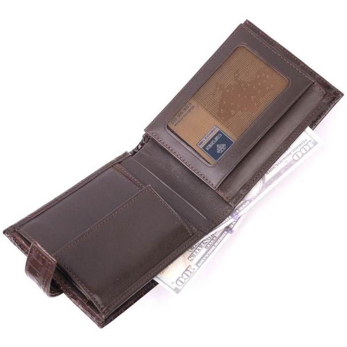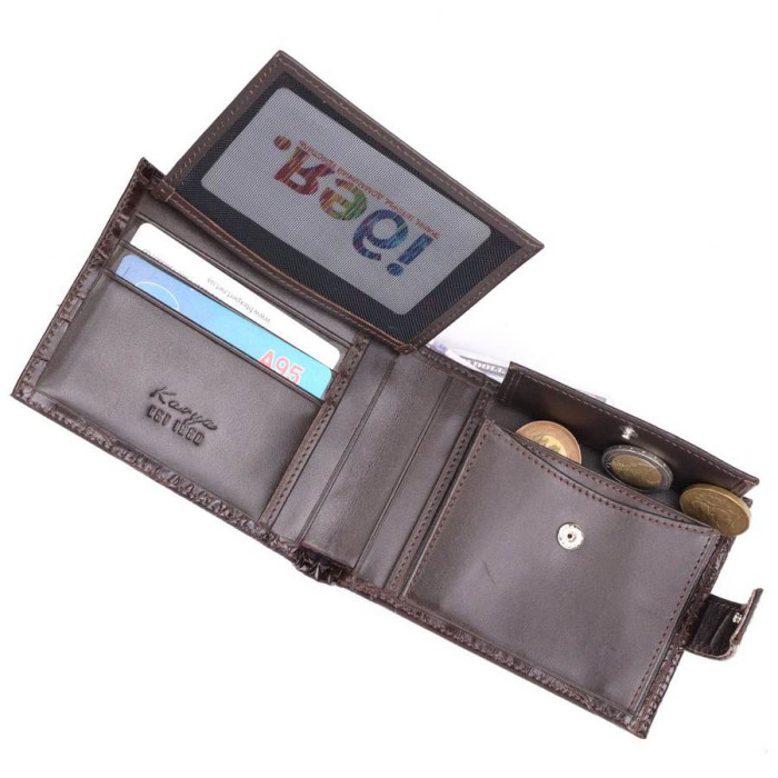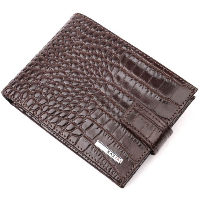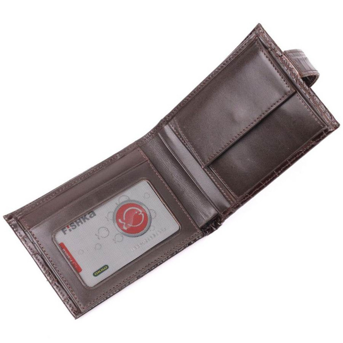 Невеликий чоловічий гаманець із натуральної шкіри з тисненням під рептилію, у коричневому кольорі. Виріб закривається на хлястик із кнопкою. На лицьовій стороні у вигляді декору розташований металевий логотип виробника. Аксесуар упакований у фірмову коробочку. Вироби з натуральної шкіри завжди будуть чудовим подарунком для близької людини.