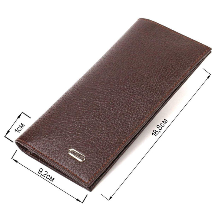 Розкішний чоловічий гаманець із натуральної зернистої шкіри флотар. Аксесуар має одне основне відділення для купюр усіх номіналів, одинадцять осередків для карток, кишеню під сіточкою для пропуску, дві приховані кишені та монетницю на блискавці. Закривається аксесуар навпіл на магніти. На лицьовій стороні, у правому нижньому куті металевий логотип компанії виробника. Купуючи шкіряний аксесуар цієї фірми, собі або на подарунок, будьте певні, що він прослужить Вам не один рік.