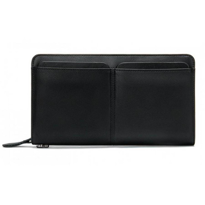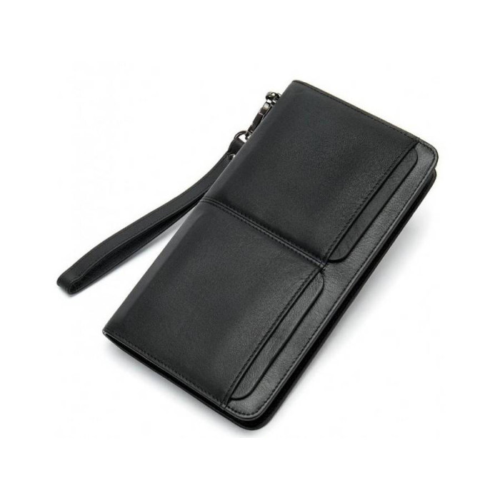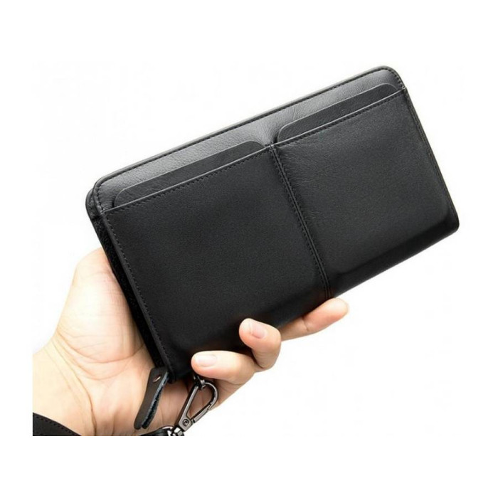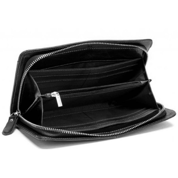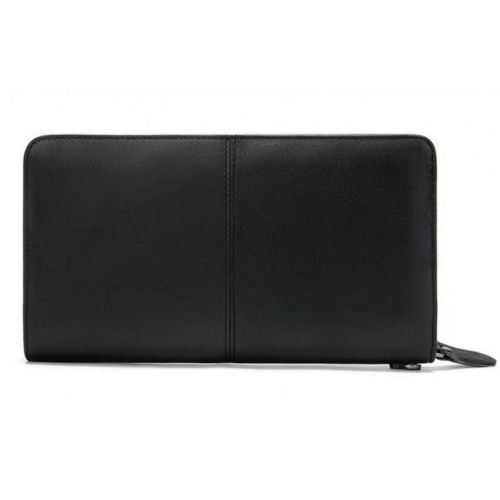 Чоловічий клатч з телячої шкіри з зернистою поверхнею. Одне основне відділення закривається на застібку-змійку зі зручним шкіряним пуллером. Усередині три відсіки для купюр відкритого типу, по центру перегородка у вигляді кишені на блискавці, з боків розташовані слоти для банківських або візитних карток. Варто відзначити знімний ремінець, який кріпиться до аксесуара за допомогою карабіна і гарантує комфортне носіння на зап'ясті.