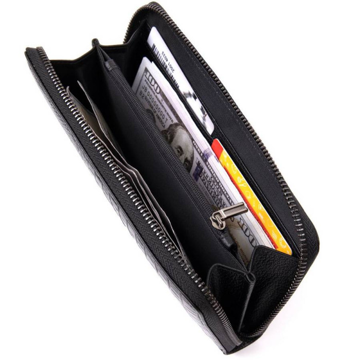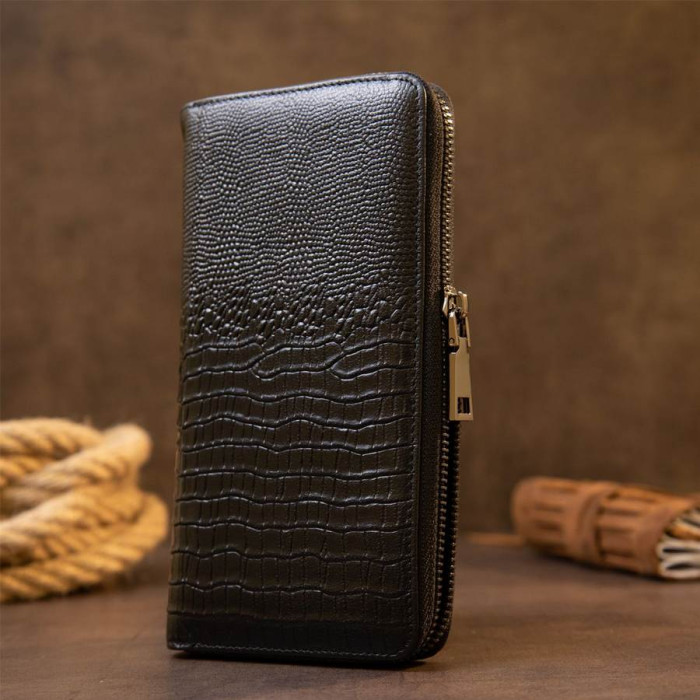 Місткий клатч з силуетом крокодила на лицьовій стороні під шкіру рептилії. Виріб виконаний в чорному кольорі. Клатч зручно лежить в руці. Має відділення для купюр і відділення для монет. Аксесуар помістить в себе купюри в розгорнутому вигляді, монети і картки. Виріб в масивному дизайні. Клатч вертикального типу. Закривається клатч на блискавку. У комплекті йде пилозахисний чохол.