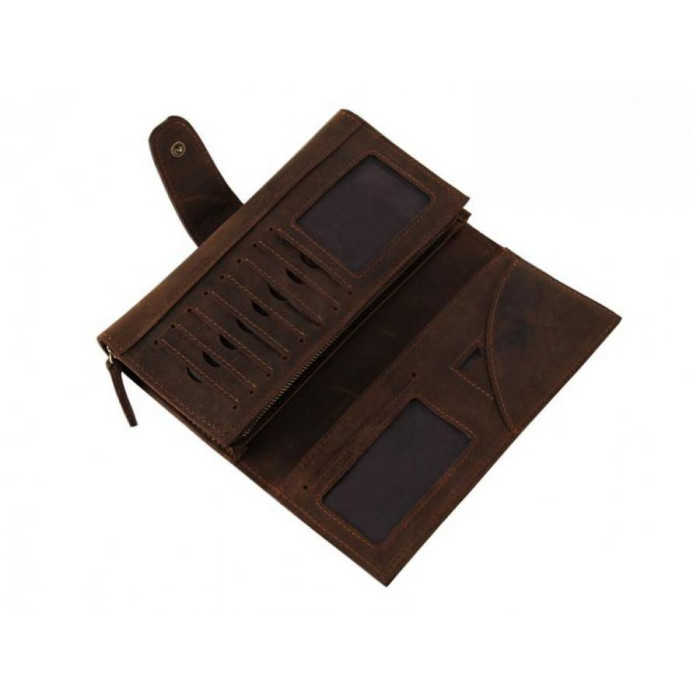 - в раскрытом виде аксессуар имеет 2 основных отсека, один из которых закрывается на молнии, под которой спрятаны 14 дополнительных секций для визитных карточек и 2 вместительных отделения. 2 отдела для фотографий, 7 секционных отделений под визитки, уголок для фиксации документов;