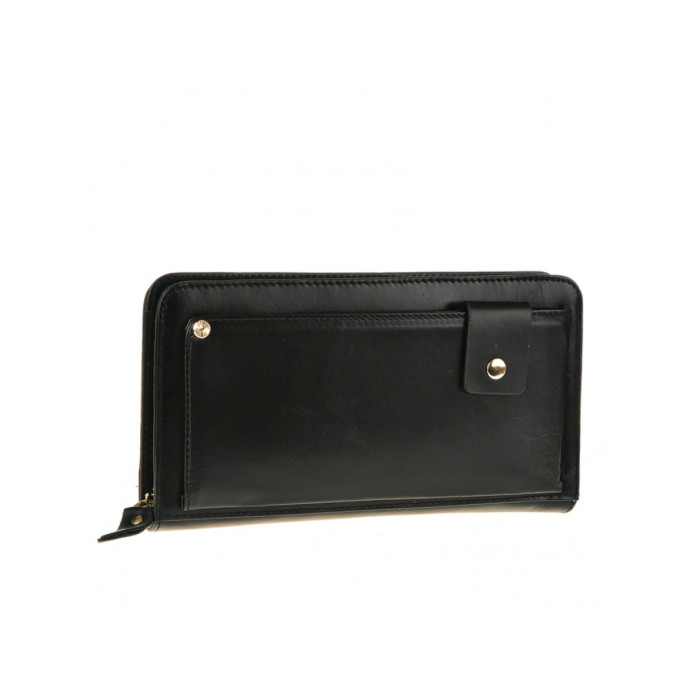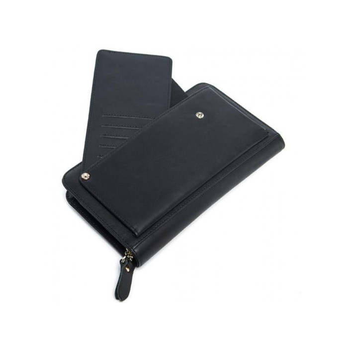 Презентабельний шикарний чоловічий клачт від бренду Tiding Bag виготовлений з натуральної шкіри люксової якості. Виріб має чорну гладку поверхню, яку підкреслює металева фурнітура. Клатч має основне відділення на блискавці, яке розділене на два відсіки за допомогою кишені-перегородки на змійці - в неї можна покласти металеві гроші, ключі або важливі документи. З лицьового боку аксесуара передбачена накладна кишеня на кнопці, де знаходиться візитниця-вкладиш. Клатч має невеликі розміри, але відрізняється місткістю і зручністю.