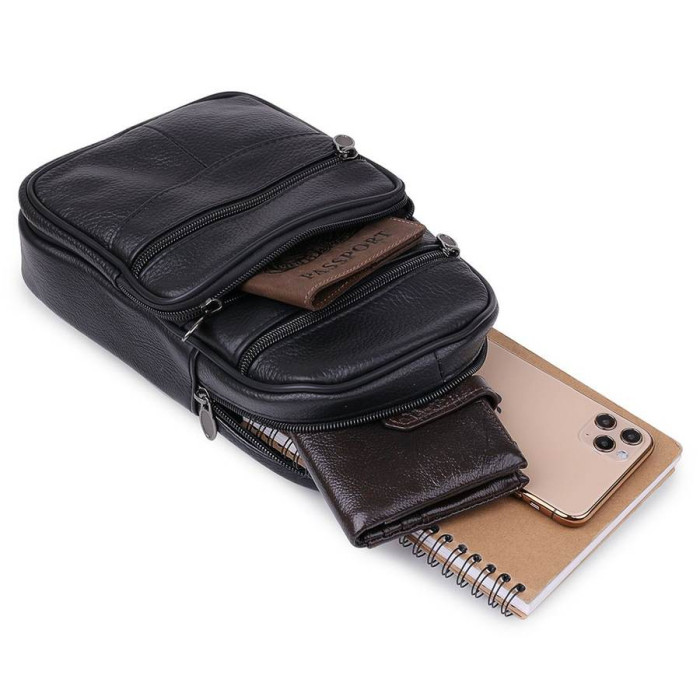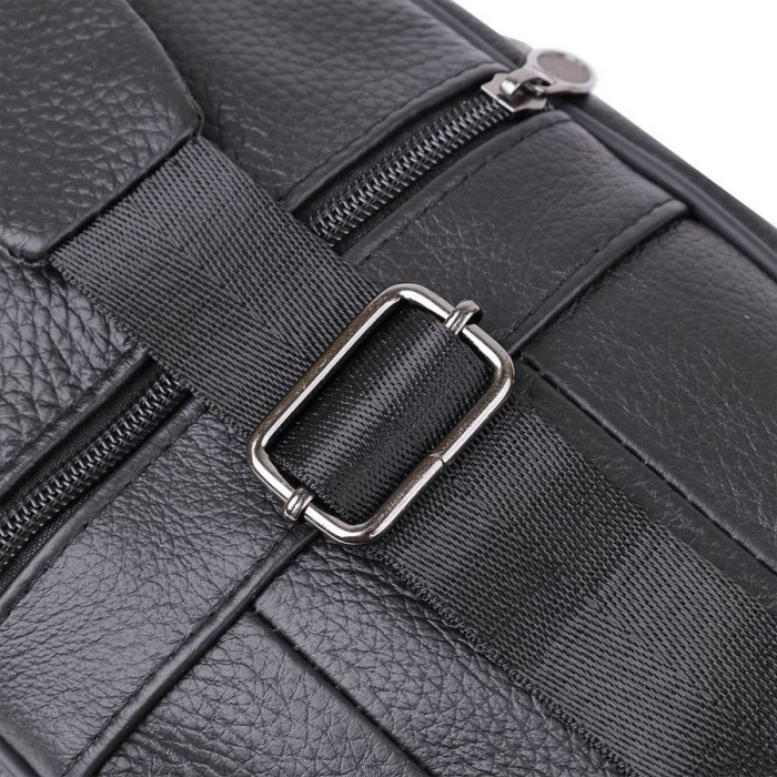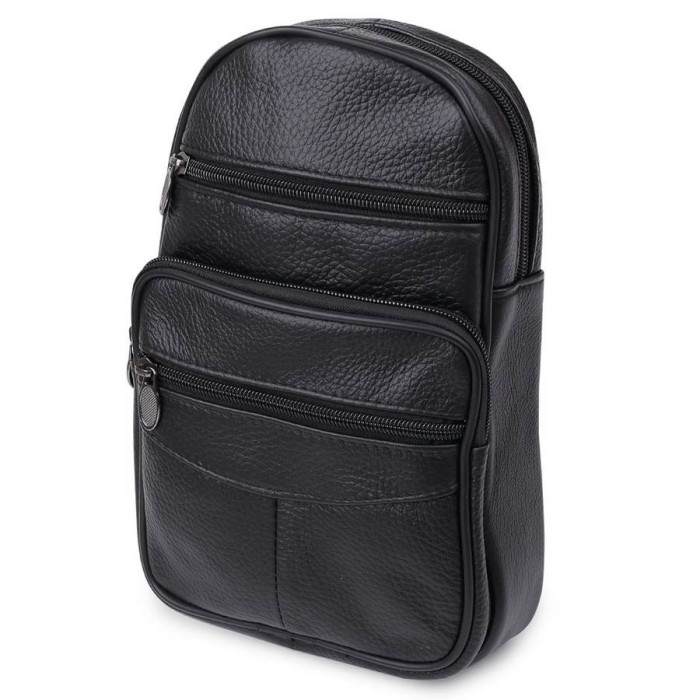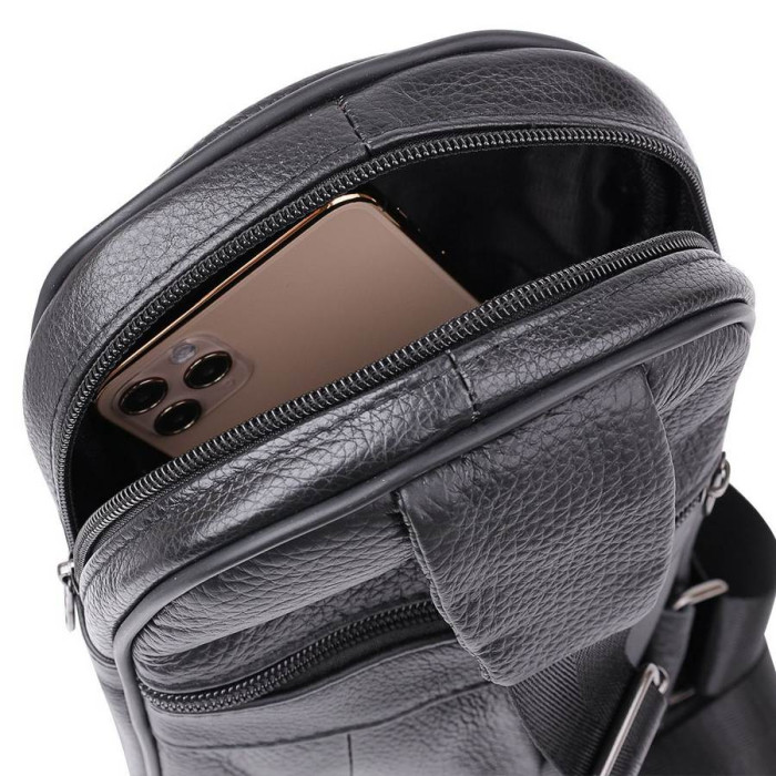 Компактна, але дуже містка чоловіча сумка через плече з натуральної шкіри високого класу з зернистою фактурою. Усередині одне просторе відділення на блискавці. На зовнішній стороні три кишені на блискавці. Також є одна кишеня на тильній стороні. Ремінь виготовлений з міцного текстилю і може регулюватися по довжині.