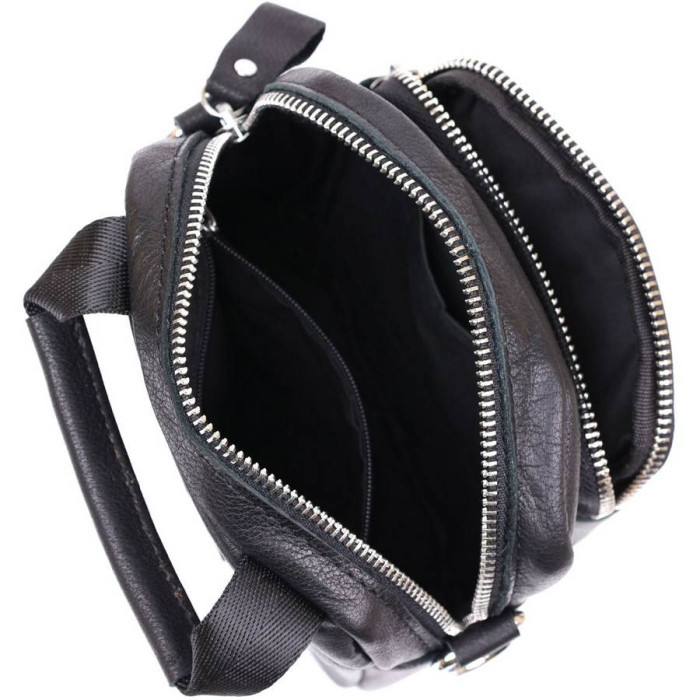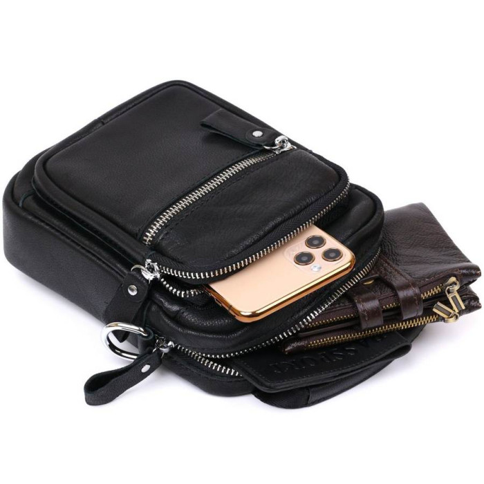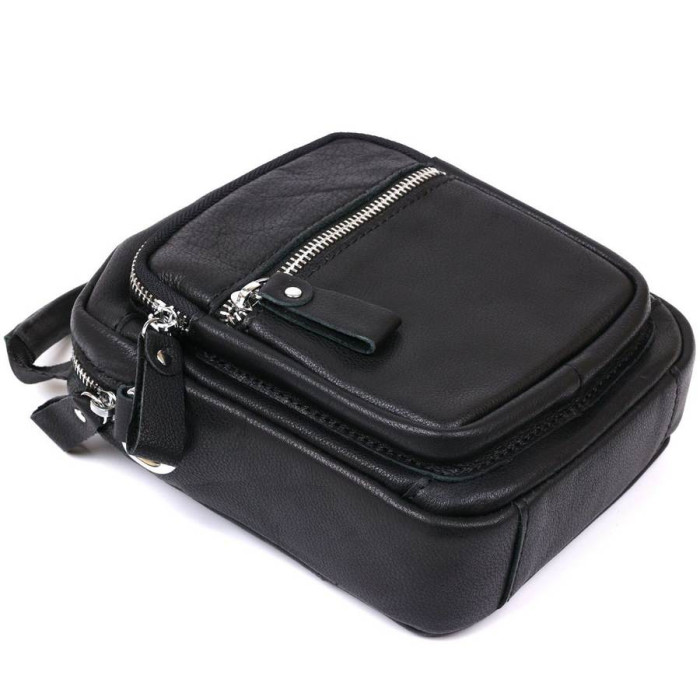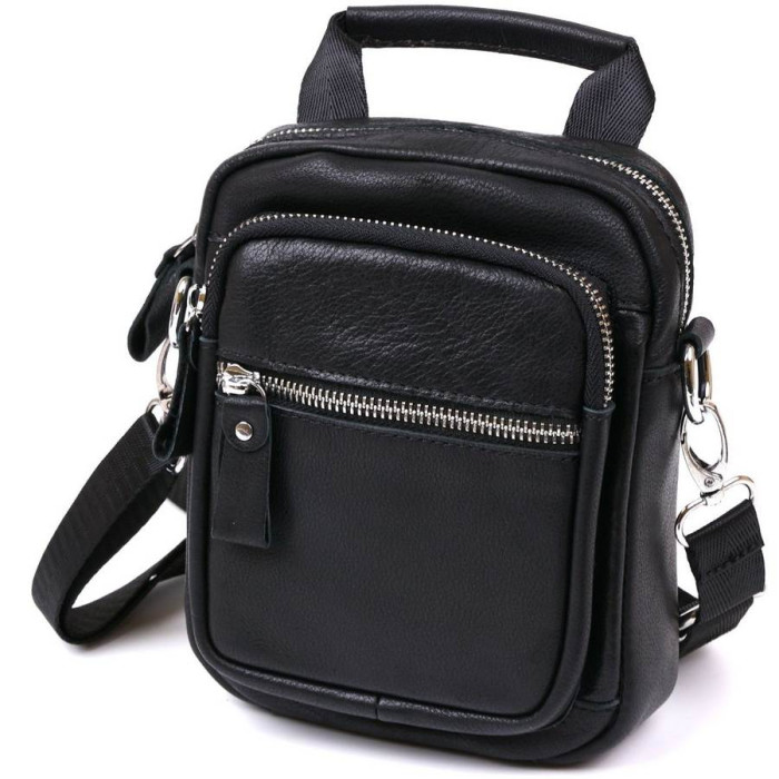 Чудова компактна сумка для чоловіків, які не люблять громіздких речей. Виконана дана модель з натуральної висококласної шкіри з гладкою приємною на дотик фактурою. Має містке основне відділення та дві додаткові кишені на зовнішній стороні. Сумку можна кріпити на пояс або носити через плече. Колір виробу – чорний.