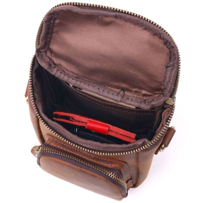 Чоловіча сумка невеликого розміру з натуральної вінтажної шкіри з відмінними характеристиками якості та зносостійкості. Аксесуар має не велике але містке основне відділення і дві додаткові кишеньки для дрібниць. Знімний плечовий ремінь можна регулювати по довжині, виконаний він із міцного текстилю. Колір фурнітури жовтий. Шкіряна сумка, завжди була чудовим подарунком для рідних та близьких людей.