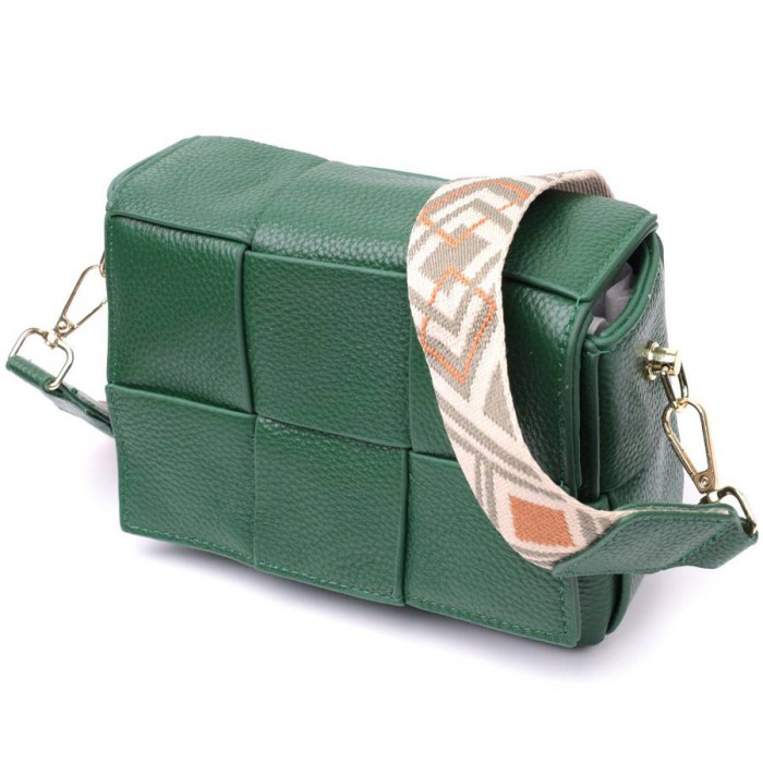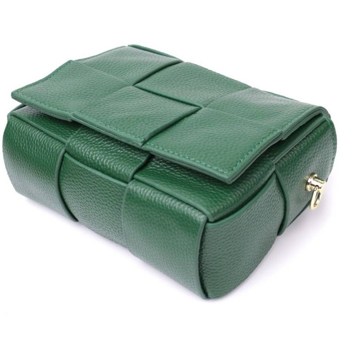 Модна жіноча сумка з переплетеної шкіри та кишенею-косметичкою всередині. Виріб пошитий з якісної натуральної м'якої шкіри, яка довго носиться і не втрачає свого первісного вигляду. Аксесуар складається з одного відділення, в якому пристібається кишеня косметичка на блискавці. Носити сумку можна під рукою, на плечі та через плече, для цього є текстильний ремінь, що знімається. У виробі використано якісну фурнітуру кольору жовтого золота. Універсальний варіант сумки як на вечір так і як сумочка на кожен день.