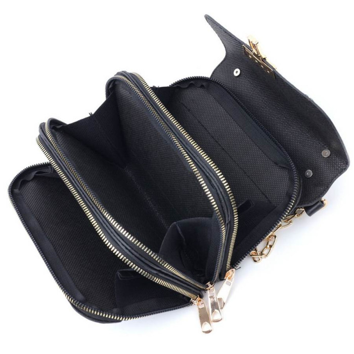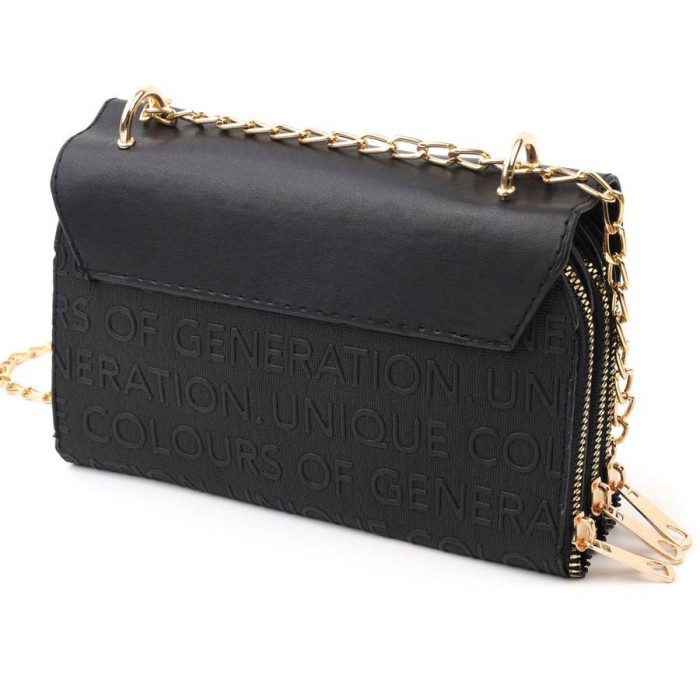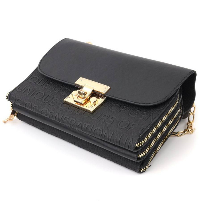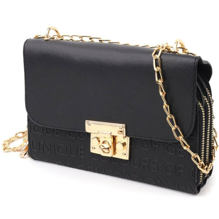 Красива мініатюрна сумка чорного кольору з якісної еко-шкіри з буквеним тисненням. Сумка має стильний дизайн, красиву механічну пряжку золотистого кольору, ремінь, що регулюється, з металевого ланцюжка і вставки з еко-шкіри. Модель довгий час залишається у ідеальному стані, таку сумку приємно носити. Може бути чудовим варіантом для подарунка стильній жінці.