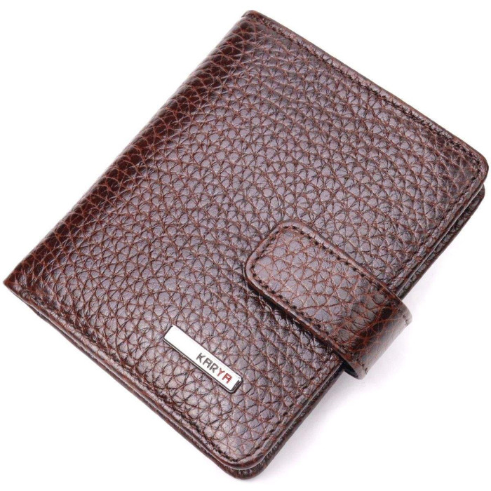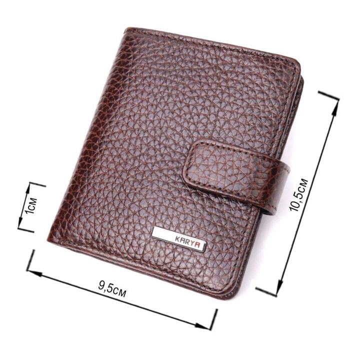 Невеликий чоловічий гаманець із натуральної шкіри, в коричневому кольорі. Виріб закривається на хлястик із кнопкою. На лицьовій стороні у вигляді декору розташований логотип виробника. Аксесуар упакований у фірмову коробочку. Вироби з натуральної шкіри завжди будуть чудовим подарунком для близької людини.