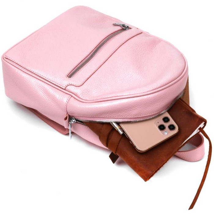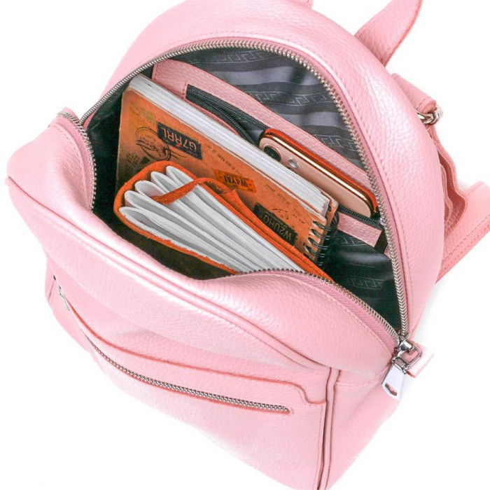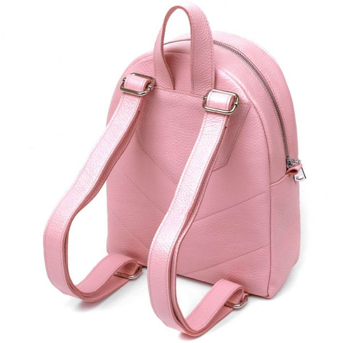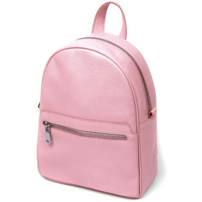 Невеликий жіночий рюкзак у міському стилі для шанувальників компактних, але містких аксесуарів. Матеріал виготовлення – натуральна шкіра високої якості та підвищеної міцності. Колір даної моделі ніжно-рожевий, фактура - зерниста і приємна на дотик. Усередині є одне відділення та дві кишені, на зовнішній стороні – кишеня на блискавці. Такий рюкзак стане чудовим подарунком коханій людині.