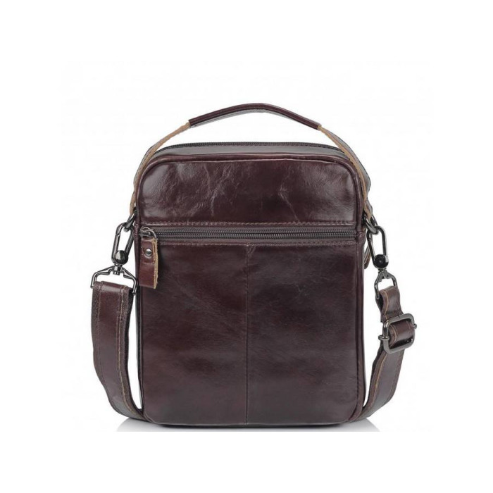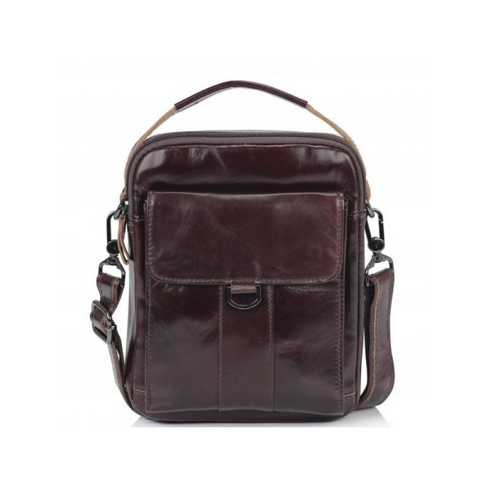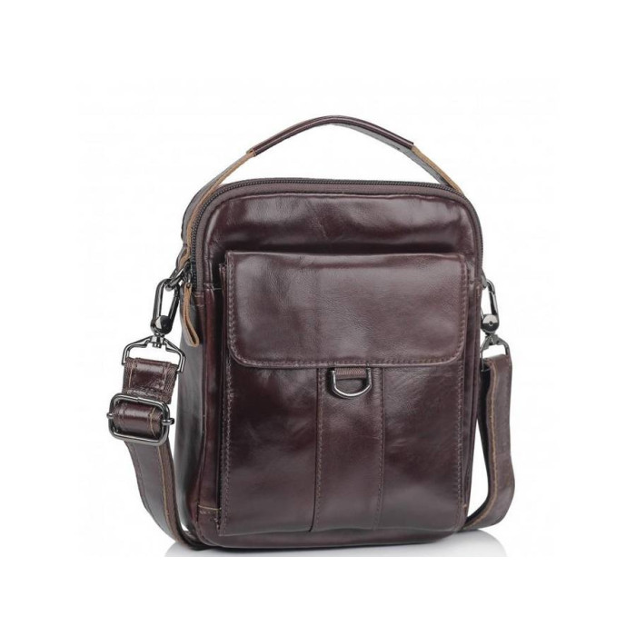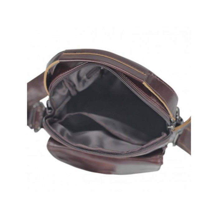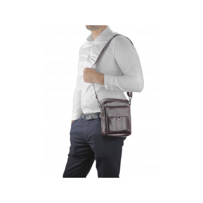 Коричнева шкіряна сумка через плече, має гладку текстуру шкіри. Текстильний ремінь зі шкіряною вставкою посередині регулюється по довжині, фурнітура темно-срібного кольору, пуллера шкіряні. Усередині сумки - одне основне відділення, кишеня на замку і кишеня відкритого типу. З лицьового боку сумки - накладна кишеня на магнітних кнопках, з тильної - одна кишеня на замку.