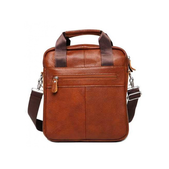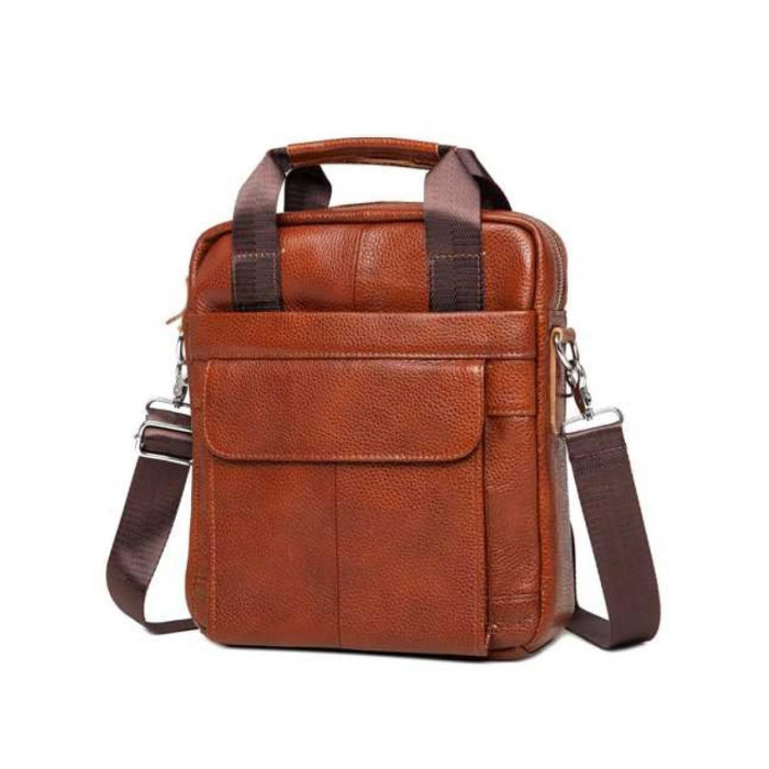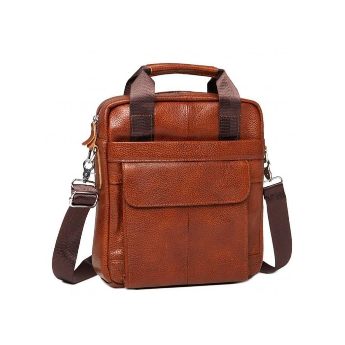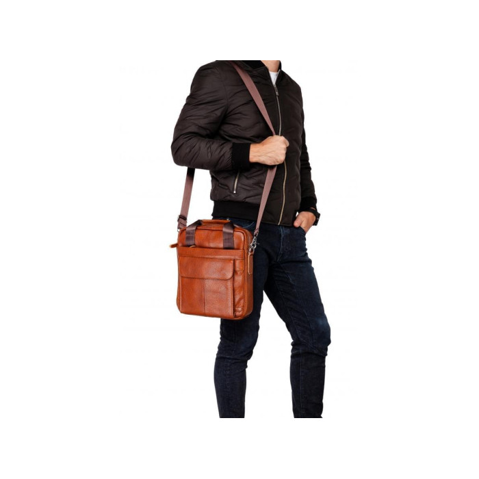 Мессенджер з телячої шкіри в світло-коричневому кольорі. Всередині основго відсіку підкладка з щільного текстилю, одна кишеня на блискавці і дві кишені відкритого типу для канцелярії або мобільного телефону. Чоловіча сумка на плече передбачає два варіанти носіння - в руках, завдяки ергономічним шкіряним ручкам або на плечі. Текстильна плечова шлейка регулюється по висоті і кріпиться за допомогою надійних металевих карабінів. Для дрібниць, до яких Ви хочете отримувати швидкий доступ передбачені два містких кишені з лицьового боку і одна кишеня на блискавкці з тильної частини сумки.