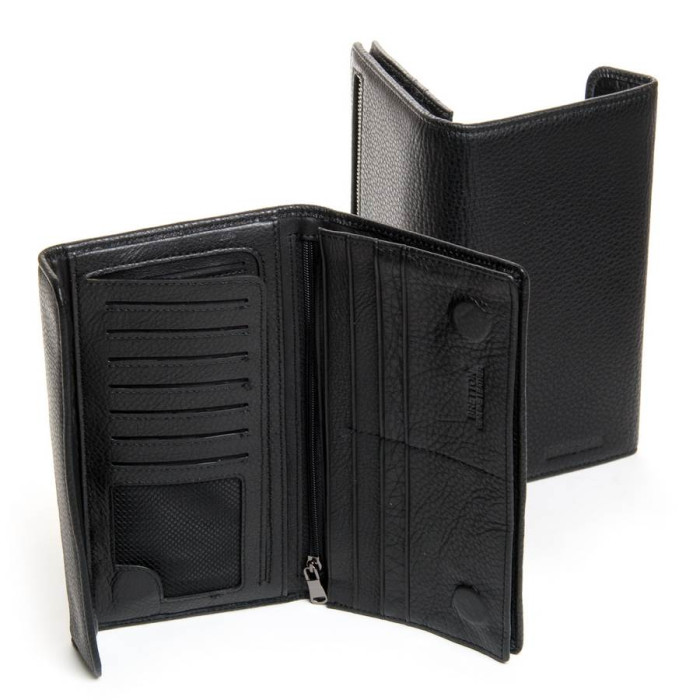 Чоловічий великий шкіряний гаманець Bretton, серія Black Edition. Виготовлений з м'якої натуральної шкіри. Закривається на прихований магніт. Всередині знаходиться одне відкрите відділення для банкнот, 19 кишень для візитних карт, 3 великих відкритих кишені і велика монетниця на блискавці. Зовні знаходиться кишеня на блискавці.