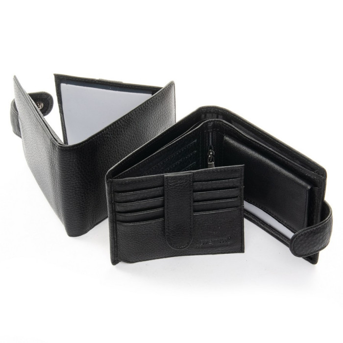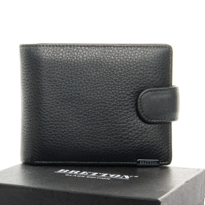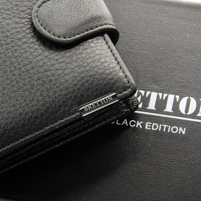 Чоловічий шкіряний гаманець Bretton, серія Black Edition. Виготовлений з м'якої натуральної шкіри. Усередині є два відкриті відділення для банкнотів, 9 кишень для візитних карт, 2 великих відкритих кишені, кишеня на блискавки і одну прозору кишеню, монетница на кнопці. Розмір (см) 12,5*9,5*3
