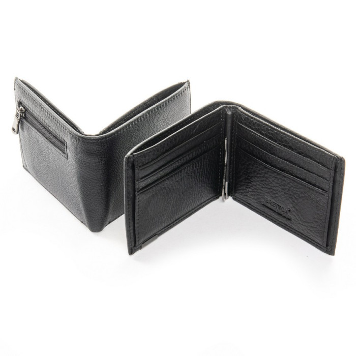 Чоловічий шкіряний гаманець-затиск для банкнот Bretton, серія Black Edition. Виготовлений з м'якої натуральної шкіри. Усередині є одне відкрите і одне на блискавці відділення для банкнот, 6 кишень для візитних карт і дві відкриті кишені. Зовні знаходиться монетніца на блискавці. Розмір (см.) 11,5*8*2,5