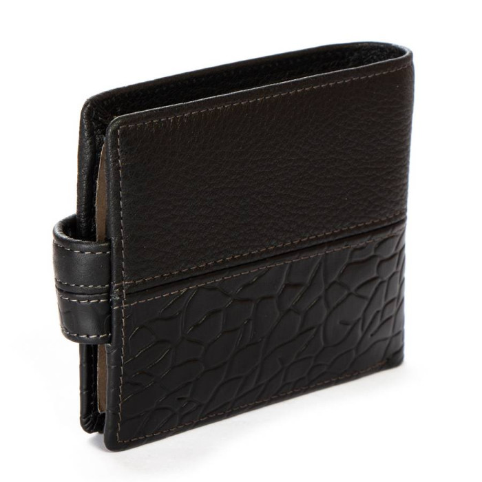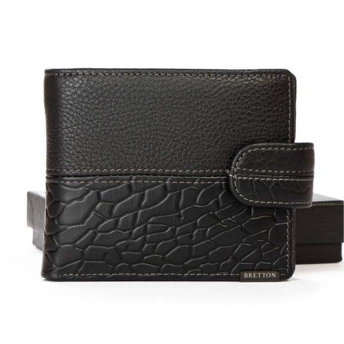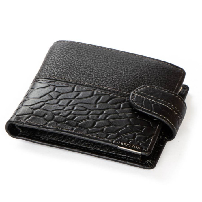 Чоловічий шкіряний гаманець Bretton, серія Black Edition. Виготовлений із м'якої натуральної шкіри. Усередині є: дві відкриті та одне на блискавці відділення для банкнот, 3 кишені для візитних карток, 2 великі кишені та монетниця на кнопці.