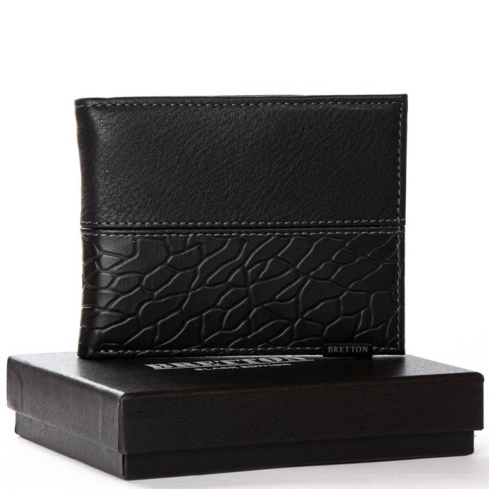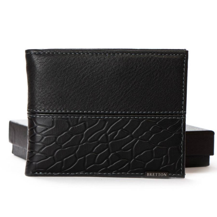 Чоловічий шкіряний гаманець із затискачем для банкнот Bretton, серія Black Edition. Виготовлений із м'якої натуральної шкіри. Закривається на прихований магніт. Усередині є: одне відкрите та одне на блискавці відділення для банкнот, кишеня-сітка та монетниця на блискавці.