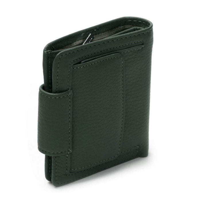 Всередині знаходяться два великих відкритих відділення для банкнот (розділені шкіряною перегородкою) і одне відділення на блискавці. Також є 12 кишень для візитних карток, 4 з яких виконані прозорими. Зовні гаманця на зворотному боці є монетниця на кнопці.