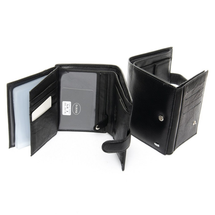 Вертикальне портмоне з натуральної шкіри з 2 відділеннями під банкноти (1 змійка), усередині - відкидний блок з правником, що застібається клапаном, відділення для дрібниці, 5 великих кишень, 8 кишень під карти. Розмір (см) 10,5*14*2