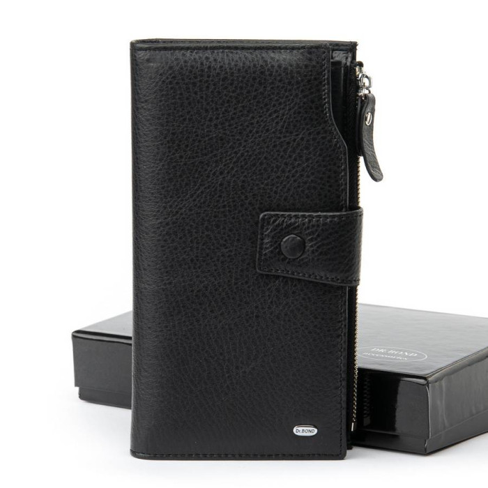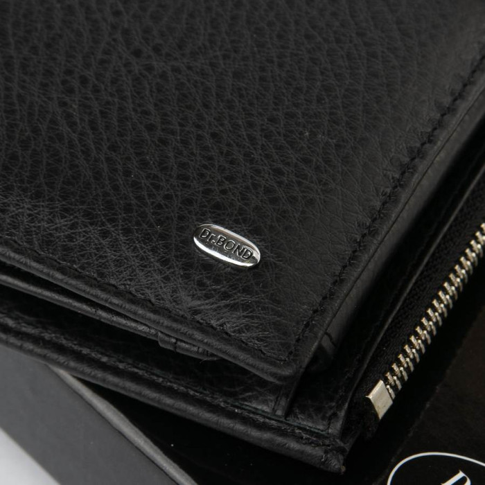 Великий шкіряний гаманець Dr. BOND. Виготовлений з м'якої натуральної шкіри. Основне відділення закривається клапаном на кнопці. Всередині є 21 кишеня для візитних карток, 3 великі відкриті кишені та одна велика кишеня під клапаном. Відділення для банкнот знаходиться зовні і закривається на блискавку. Розмір (см.) 10*19*3