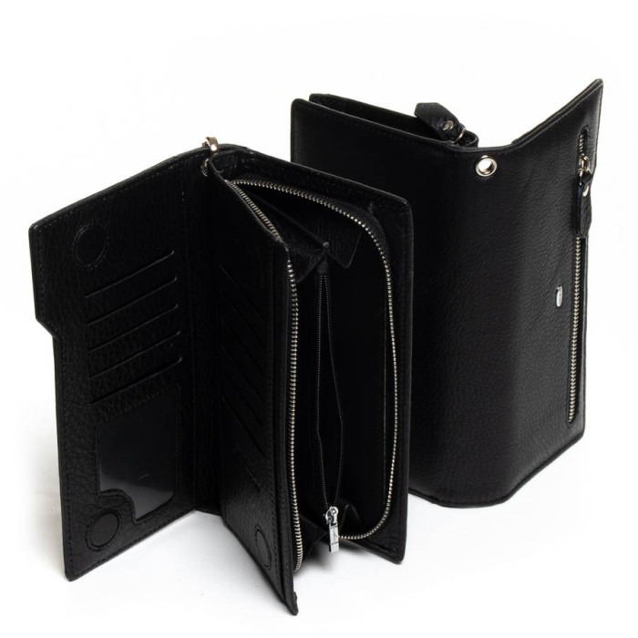 Великий шкіряний гаманець Dr.Bond. Виготовлений з м'якої натуральної шкіри. Переднє відділення закривається на магнітні кнопки. Усередині знаходяться 11 кишень для візитних карток і 2 великих відкритих кишені. Зовні знаходиться подвійне відділення для банкнот, розділене кишенею-монетницею на блискавці. На фасаді гаманця розташована велика кишеня на блискавці. В комплекті є знімна кистьова ручка.