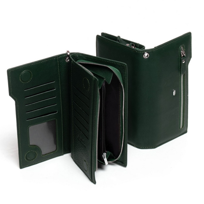 Великий шкіряний гаманець Dr.Bond. Виготовлений з м'якої натуральної шкіри. Переднє відділення закривається на магнітні кнопки. Усередині знаходяться 11 кишень для візитних карт і 2 великі відкриті кишені. Зовні знаходиться подвійне відділення для банкнот, розділене кишенею-монетницею на блискавці. На фасаді гаманця розташована велика кишеня на блискавці. У комплекті є знімна кистьова ручка. Розмір (см) 19,5*10,5*3