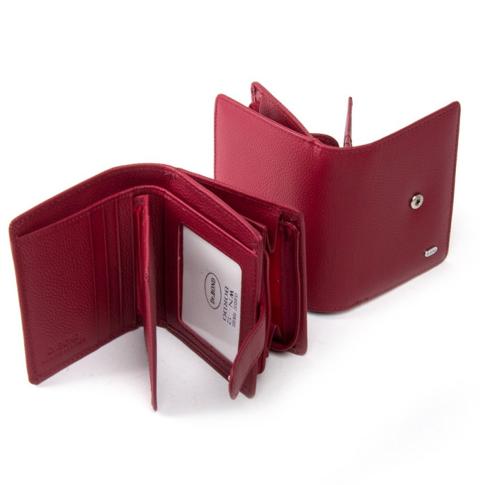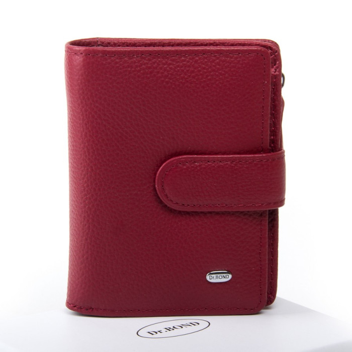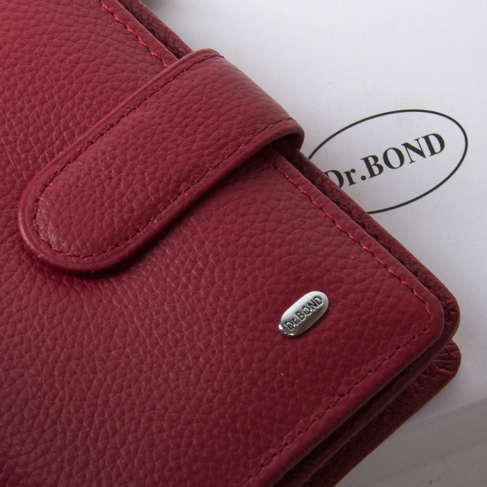 Жіночий гаманець Dr.Bond. Виготовлений з натуральної м'якої шкіри з природною текстурою. Основне відділення закривається клапаном на кнопці. Всередині знаходиться одне відкрите відділення для банкнот, 10 кишень для візитних карток і 1 прозорий кишені. Зовні гаманця на зворотному боці знаходиться подвійна монетниця на блискавки.