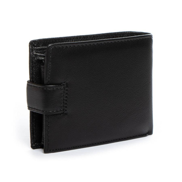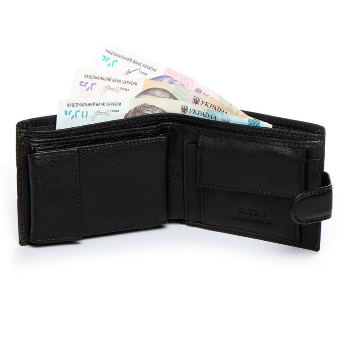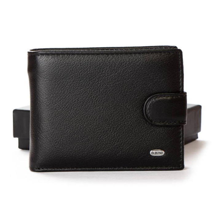 Чоловічий шкіряний гаманець Dr. Бонд. Закривається клапаном на кнопці. Усередині знаходяться: 3 відділення під банкноти (1 відділення закривається на блискавку, шкіряна перегородка), монетниця на кнопці, 2 кишені. У внутрішньому блоці є 14 прозорих кишень для карток.