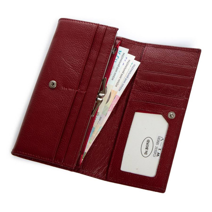 Великий шкіряний жіночий гаманець Dr.Bond. Закривається на кнопку. Усередині знаходяться три відділення для банкнот, монетниця на клямці, велика відкрита кишеня і кишеня на блискавці. Дев'ять кишень для карт і одна з яких прозора. Зовні на зворотному боці є велика відкрита кишеня.