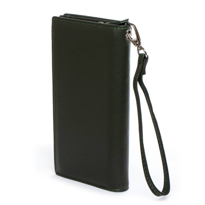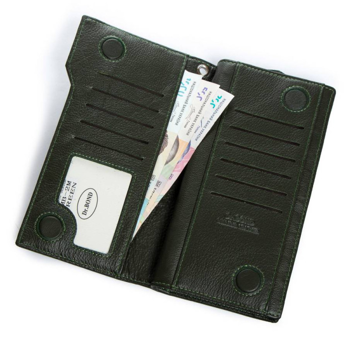 Великий шкіряний гаманець Dr.Bond. Виготовлений з м'якої натуральної шкіри. Переднє відділення закривається на магнітні кнопки. Усередині знаходяться 11 кишень для візитних карт і 2 великі відкриті кишені. Зовні знаходиться подвійне відділення для банкнот, розділене кишенею-монетницею на блискавці. На фасаді гаманця розташована велика кишеня на блискавці. У комплекті є знімна кистьова ручка.