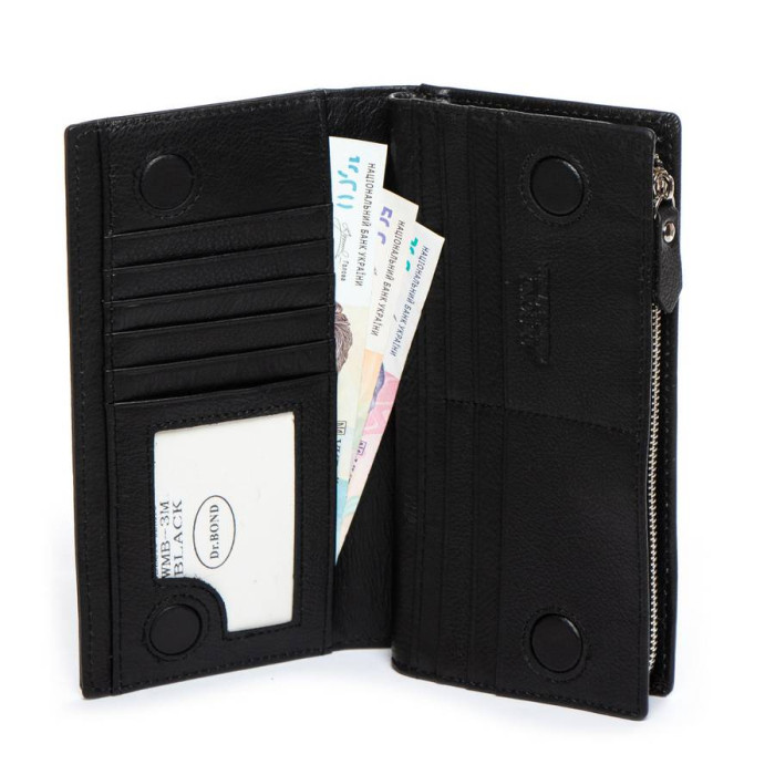 Великий шкіряний гаманець DR. BOND. Виготовлений з м'якої натуральної шкіри. Переднє відділення закривається на магнітні кнопки. Усередині знаходяться 12 кишень для візитних карт і одна велика відкрита кишеня. Подвійне відділення для банкнот з кишенею-монетницею на блискавці, закривається на загальну блискавку.