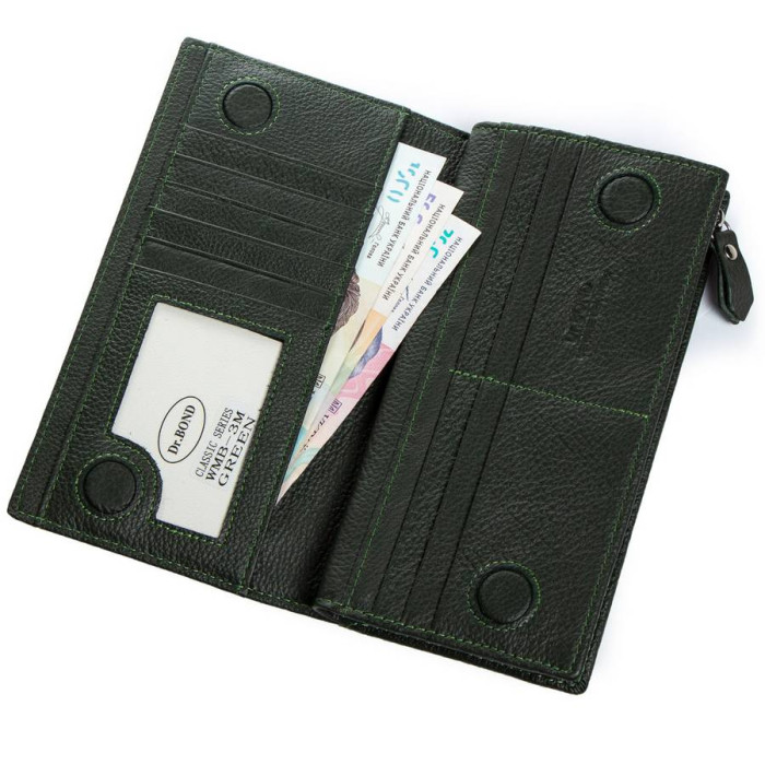 Великий шкіряний гаманець Dr.Bond. Виготовлений з м'якої натуральної шкіри. Переднє відділення закривається на магнітні кнопки. Усередині знаходяться 12 кишень для візитних карт і одна велика відкрита кишеня. Подвійне відділення для банкнот з кишенею-монетницею на блискавці, закривається на загальну блискавку. Розмір (см) 10*19*3