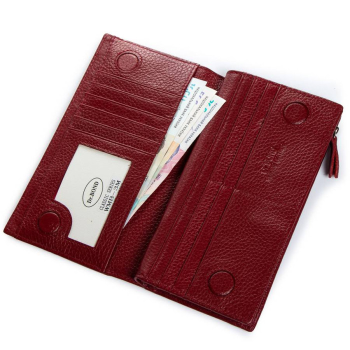 Великий шкіряний гаманець Dr.Bond. Виготовлений з м'якої натуральної шкіри. Переднє відділення закривається на магнітні кнопки. Усередині знаходяться 12 кишень для візитних карт і одна велика відкрита кишеня. Подвійне відділення для банкнот з кишенею-монетницею на блискавці, закривається на загальну блискавку.