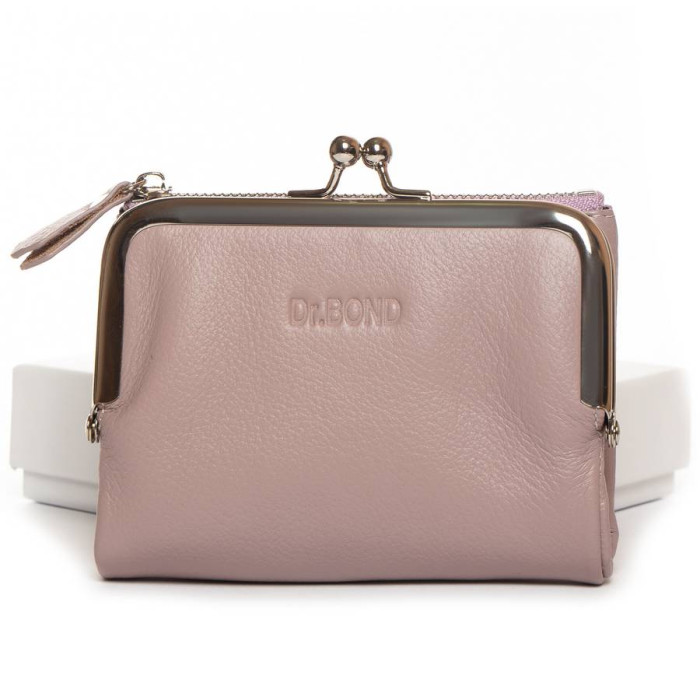 Шкіряний жіночий гаманець Dr.Bond. Складається вдвічі та закривається на кнопку. Усередині знаходяться: одне відкрите відділення для банкнот, 6 кишень для візитних карток та 2 великі кишені. Зовні гаманця є дві монетниці, одна на клямці, а інша закривається на блискавку.