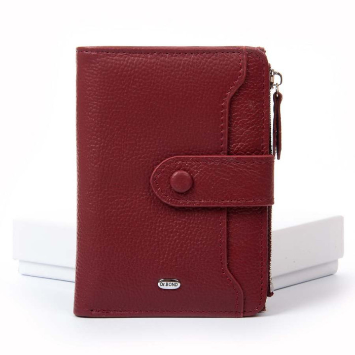 Жіночий гаманець Dr.Bond. Виготовлений із натуральної м'якої шкіри. Закривається клапаном на кнопці. Усередині знаходяться одне відкрите відділення для банкнот, 6 кишень для карток та 2 великі кишені. Зовні гаманця є монетниця на блискавці, відкрита кишеня на фасаді та невелика кишеня на блискавці на звороті.