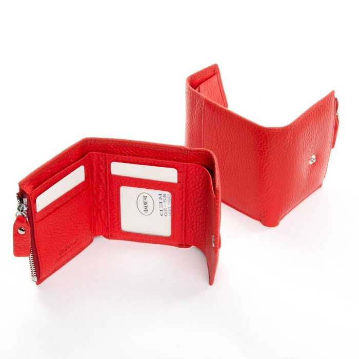 Жіночий компактний шкіряний гаманець DR. BOND. Основне відділення закривається клапаном на кнопку. М'яка шкіра з натуральною текстурою. Всередині знаходиться одне велике відкрите відділення для банкнот, 5 кишень для візитних карт і 2 великі відкриті кишені, а також монетница на блискавці. Ззовні гаманця на зворотному боці є плоска відкрита кишеня.