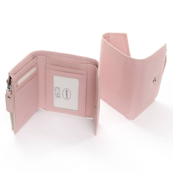 Компактний жіночий гаманець DR. BOND. Виготовлений з м'якої натуральної шкіри. Закривається клапаном на кнопку і складається удвічі. Всередині є одне відкрите відділення для банкнот, монетница на блискавці, 5 кишень для візитних карт і 2 великі кишені. Розмір (см) 12,5*9*2,5