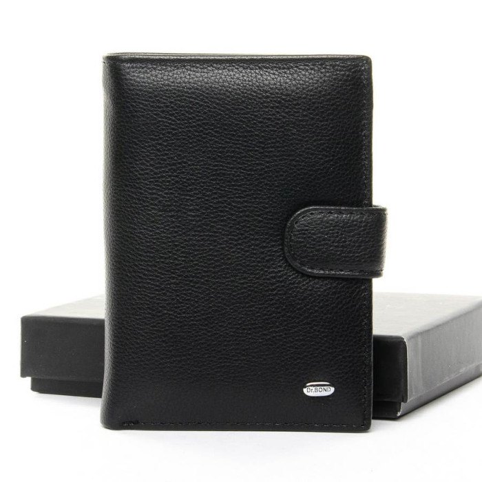 Вертикальне чоловіче шкіряне портмоне Dr.Bond. Два відкритих відділення для банкнот і монетниця на кнопці. Три кишені для візитних карток та дві великих кишені. Є знімний блок з двома прозорими кишенями для водійських документів нового зразка. Розмір (см) 9,5*13,5*2,5