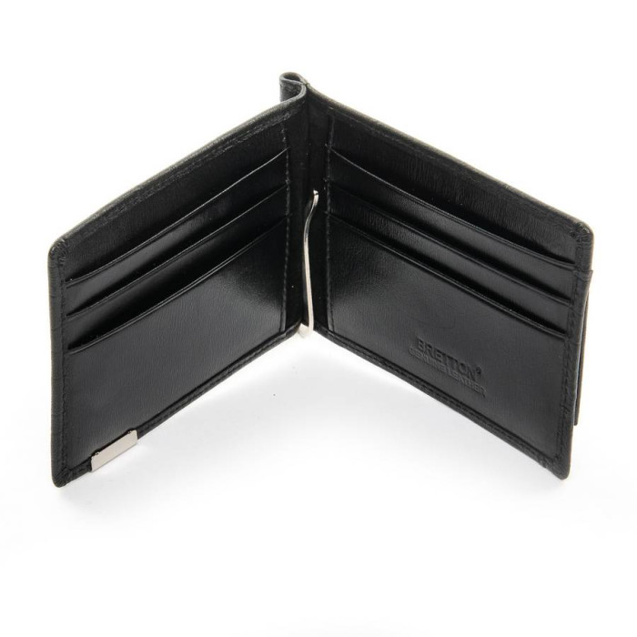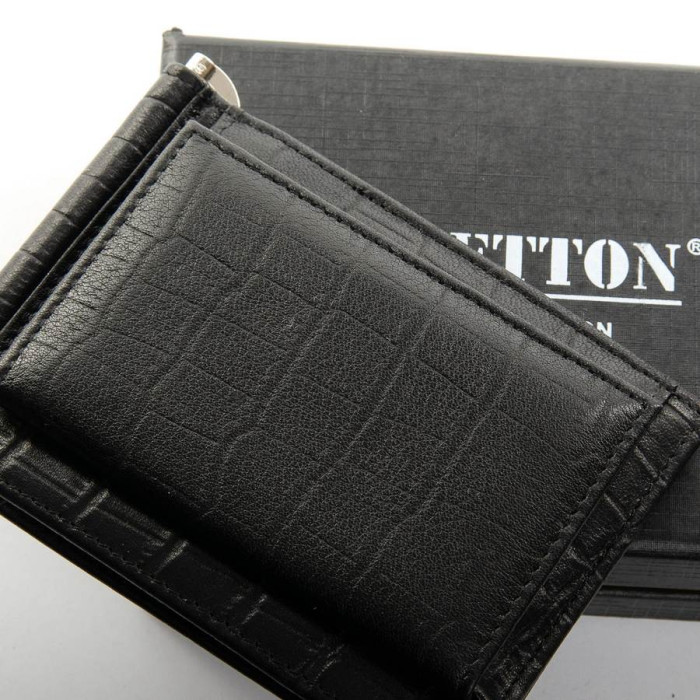 Чоловік шкіряний затиск для банкнот Bretton, серія Black Edition. Виготовлений з щільної шкіри з текстурою "рептилія". Всередині є 6 кишень для візитних карток. Зовні знаходиться монетниця на кнопці.