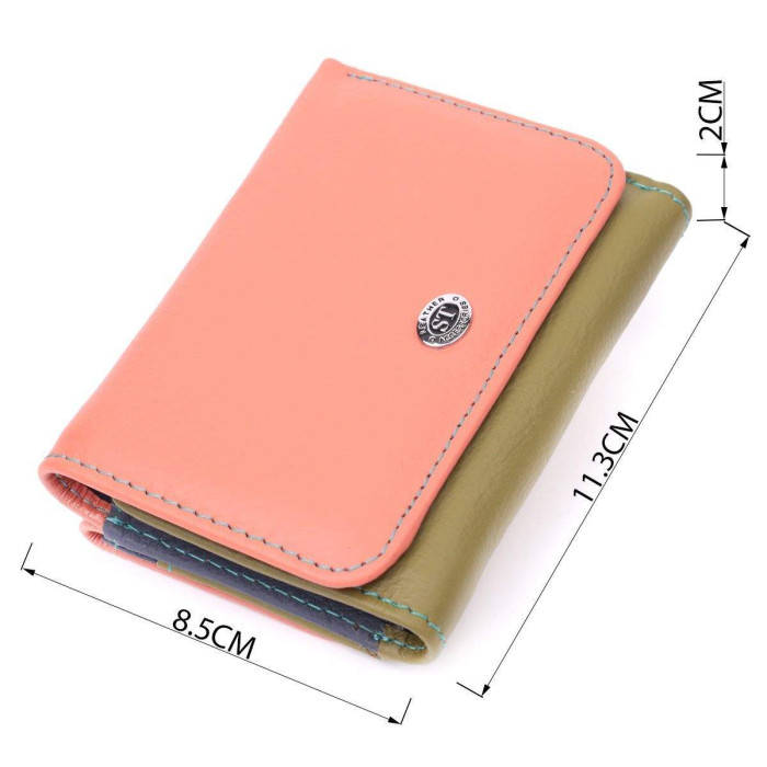 Стильний жіночий гаманець середнього розміру із натуральної шкіри. Відмінна риса цього гаманця двокольорова зовнішня частина та багатобарвна внутрішня частина. Дана модель потрійного додавання, яка закривається на клапан з магнітом. Усередині є два відділення для купюр, монетниця, п'ять слотів під пластикові карти, одне віконце для фото, а також два приховані відділення. Відмінний функціонал та зручний розмір створює ідеальну модель гаманця для повсякденного використання.