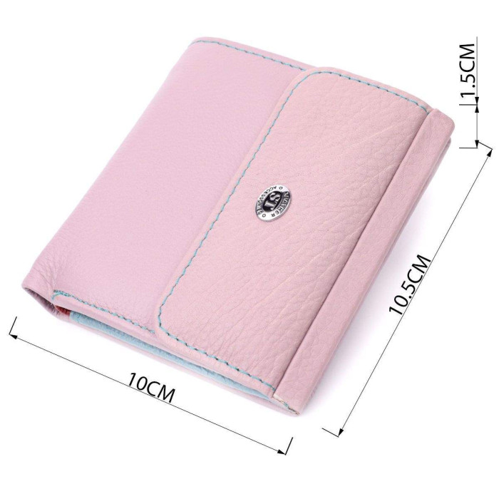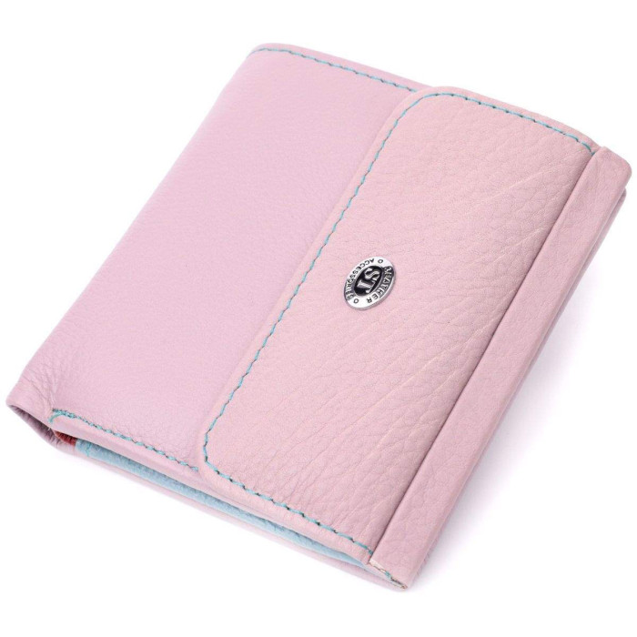 Незвичайне кольорове портмоне для жінок середнього розміру із натуральної шкіри найвищої якості. Акцентом цього гаманця є колір, точніше кілька кольорів – він бежево-рожевого кольору зовні та багатобарвний усередині. Аксесуар складається з двох містких відділень для купюр, кишені на блискавці, чотирьох осередків для карт, прихованої кишені, прозорої кишені та кишені для монет. Зовні виріб прошитий рівним рядком бірюзового кольору по краю і прикрашений металевим логотипом компанії виробника, який розміщений вгорі посередині. Портмоне доповнено надійною фурнітурою та міцною підкладкою. Укомплектований гаманець у фірмову картонну коробку білого кольору.