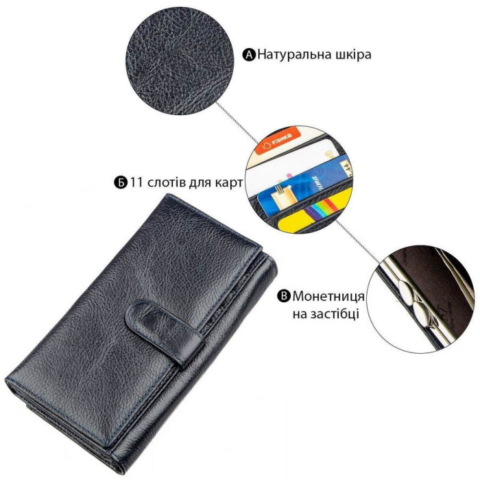 Багатофункціональний гаманець-клатч для ділових жінок. Матеріал виконання високоякісна натуральна шкіра з чудовими характеристиками. Має незвичайний темно-сірий колір з нотками синього, відтінок - матовий. Якщо Ви звикли носити з собою багато необхідних речей, то дана модель Вам обов'язково підійде. Адже в гаманці є місткі відділення для всіх цінностей, в тому числі для купюр, монет, фото, кредитних карток, візиток та інших дрібниць. Даний клатч стане для Вас чудовим придбанням або дивовижним подарунком для рідної людини. Упаковано виріб в фірмову білу коробку з логотипом.