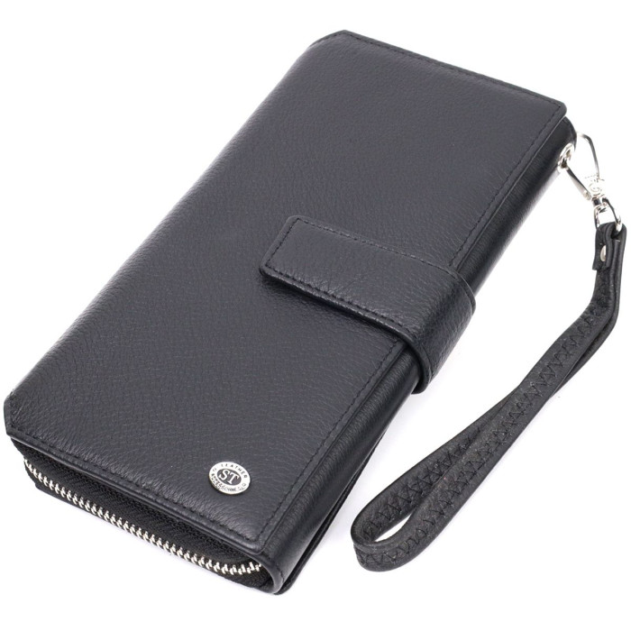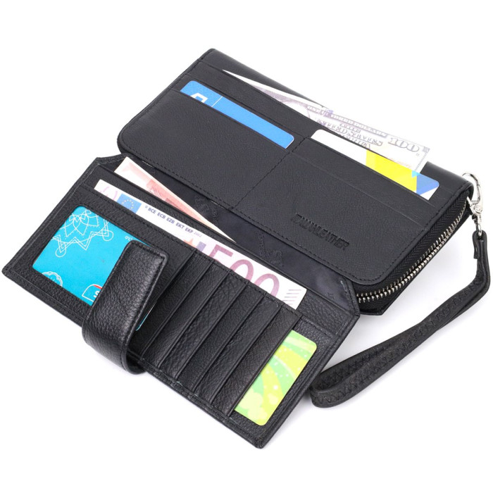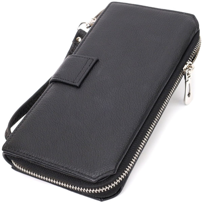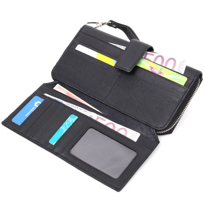Функціональний гаманець-клатч із добротної натуральної шкіри, що має м'яку зернисту фактуру. Клатч складається з трьох основних відділень усередині яких розташовані два широкі відділення, дванадцять слотів для карток, два осередки під плівкою, шість прилеглих кишень і монетниця. Закриваються два бічні відділення на шкіряний хлястик із двома кнопками, а відділення посередині на металеву блискавку. Носити цей гаманець-клатч можна в руці та на зап'ясті, для цього передбачений шкіряний ремінець, що знімається. Пакування – біла фірмова коробка. У такий аксесуар легко помістяться купюри будь-яких розмірів, кредитні картки, телефон і багато іншого, що потрібно сучасній людині.